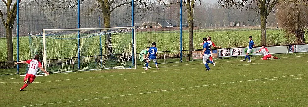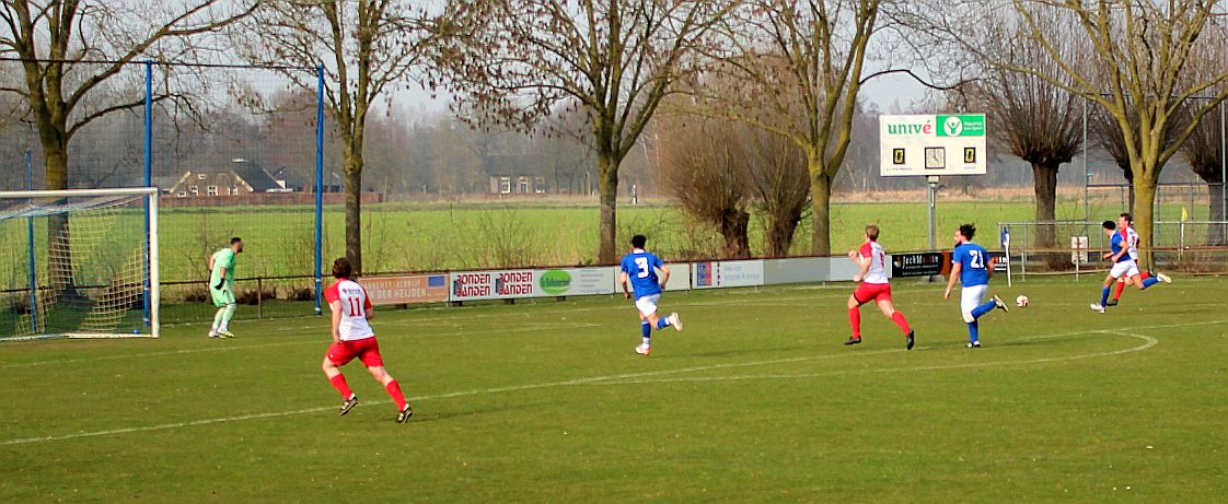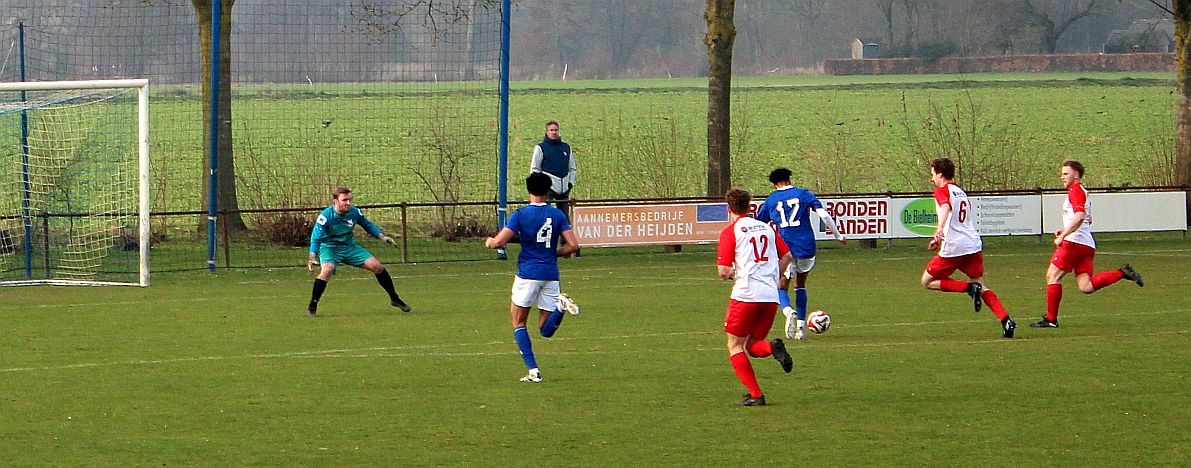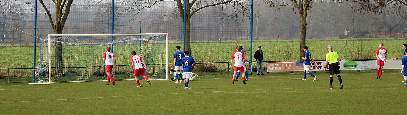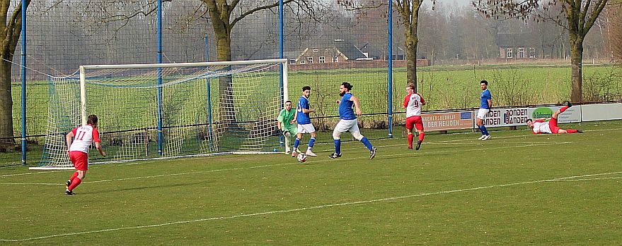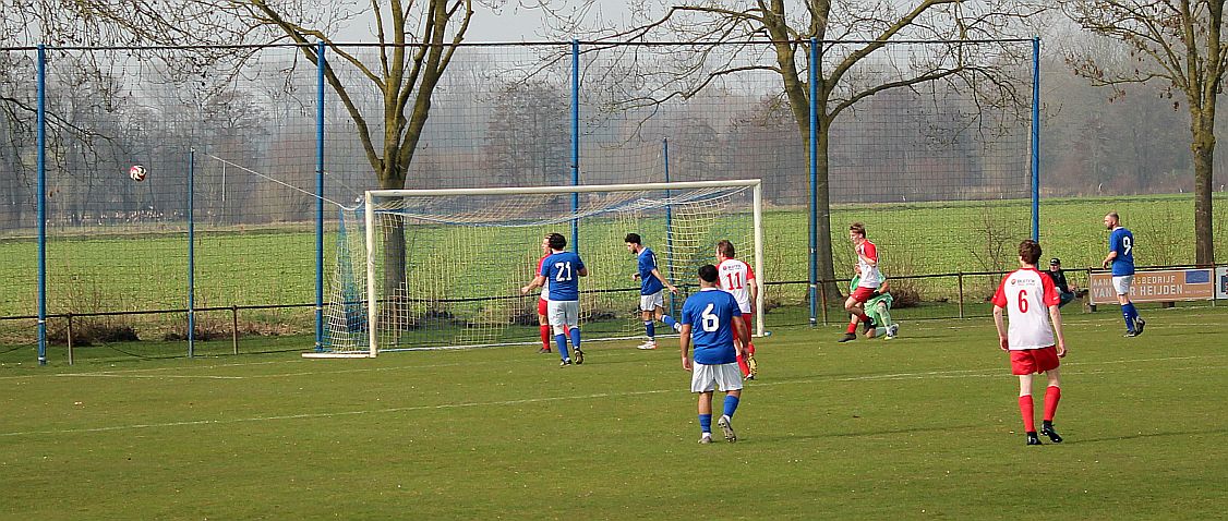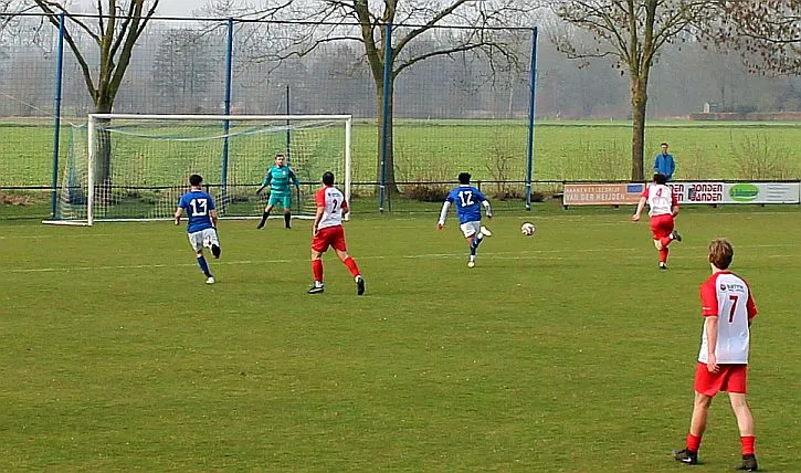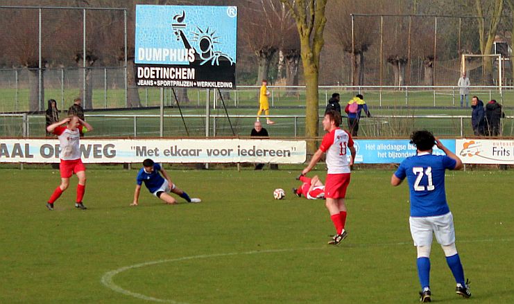 De mannen van coach Elders begonnen overtuigend aan het duel en bepaalden vanaf het begin de wedstrijd. Al snel werden via mooie combinaties twee goede schietkansen gecreëerd maar die waren vooralsnog niet besteed aan Bas en Sven. Ook Bram kreeg tot tweemaal toe een beste kans maar toen ook dit geen goal opleverde, werden de aanwezige Harfsense toeschouwers ondanks het goede spel toch een beetje benauwd omdat een bekende voetbalwet leert dat het missen van vele kansen aan de ene kant vaak betekent dat het aan de andere kant wel direct raak is. Dat was vandaag ook bijna zo want na een half uur spelen kwam Doetinchem voor het eerst goed door en kreeg het direct een reuzenkans. Gelukkig voor Harfsen werd de bal van slechts een meter of vijf voor de goal van Thom over geschoten maar dit had maar zo tegen alle verhoudingen in een voorsprong voor Doetinchem kunnen betekenen.