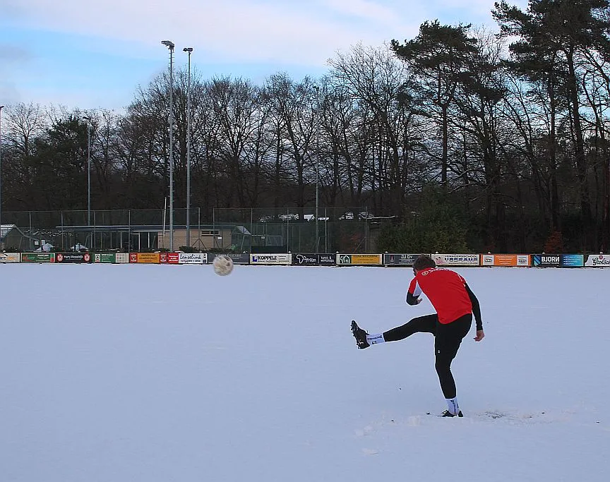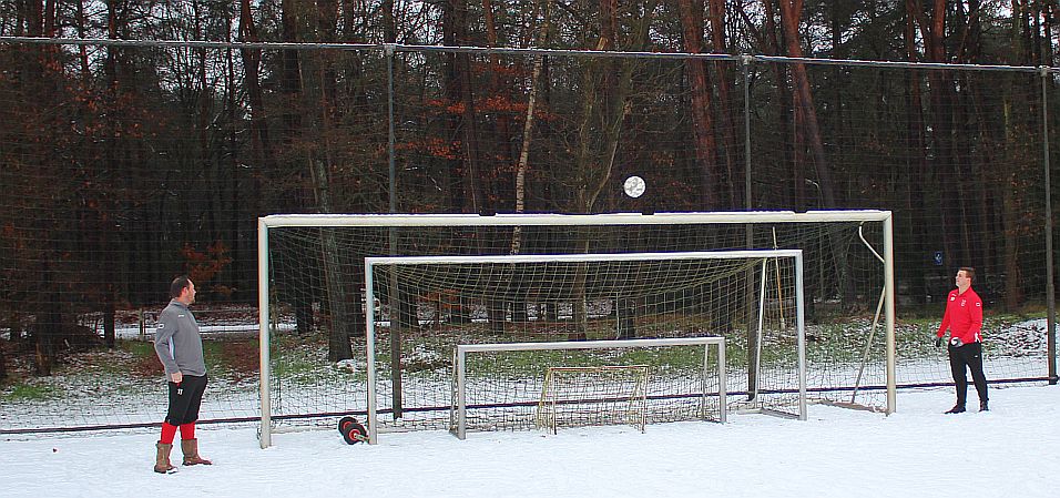 Buiten ligt een mooi pak sneeuw dat het spelelement wat moeilijker maakt. Niet alleen om te voetballen maar ook omdat er veel met sneeuwballen wordt gegooid. Het levert mooie plaatjes op. De winnaar blijkt het team van Luc Valkeman, zij winnen de slagroomtaart.