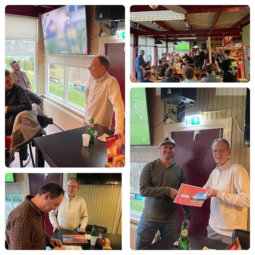 Eddie benoemd de prestaties van alle elftallen en wordt dan verrast door Twan die namens het derde team een cadeau geeft aan de jubilerende club. Het is een cheque van €500. Met het verzoek erbij om dit te besteden aan de supportersvoorzieningen op veld twee, hun geliefde thuishonk. Het wordt in dank en met een lach aanvaard, die uitdaging gaat het bestuur graag aan.