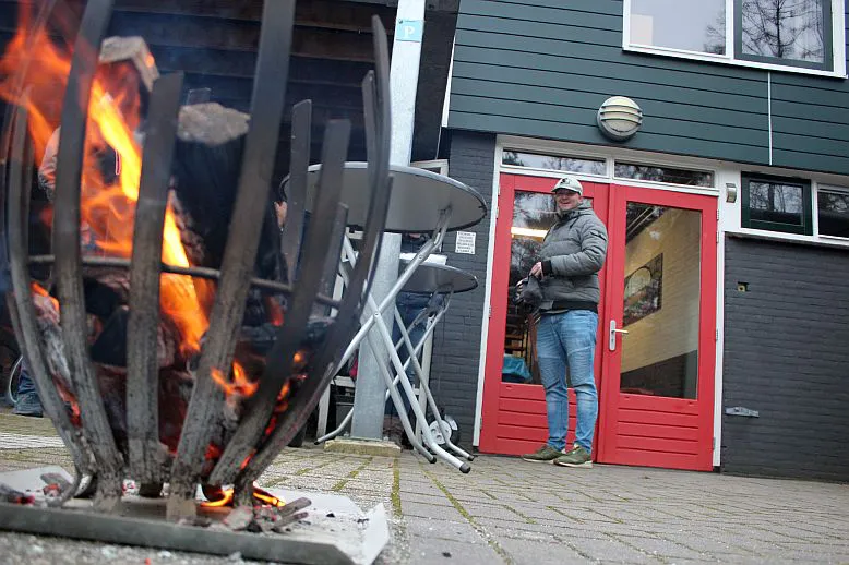 De jubileumcommissie ving alle bezoekers op bij de ingang met een glühweintje bij het houtvuur. De glühwein werd in dank aanvaard maar men ging liever naar binnen en uit de wind. Geef ze eens ongelijk. Wel werd nog gauw even door sommigen een foto gemaakt voor de dorpskwis (op te vragen bij de fotograaf).