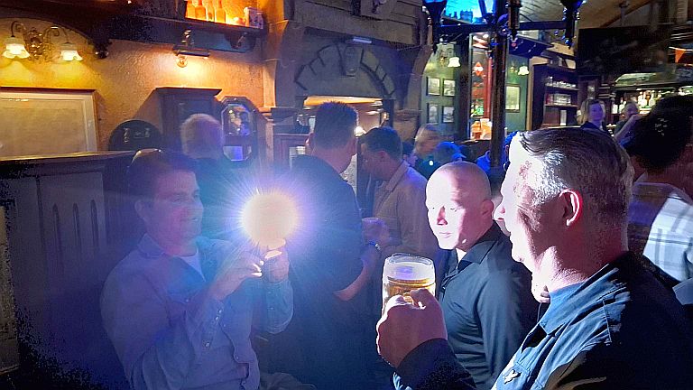 Rond 22 uur zat alles achter de knopen en werd het tijd om de Hackescher Markt te verkennen. In een op fooien beluste Berlijnse horeca, werd dit restaurant door de penningmeester ontstoken van een fooi. Gin gulash gin fooi! Al snel werd een Ierse pub gevonden, waar het bier rijkelijk vloeide. Voor sommigen tot in de late uurtjes, wetende dat het ontbijt om half 9 al weer wachtte.