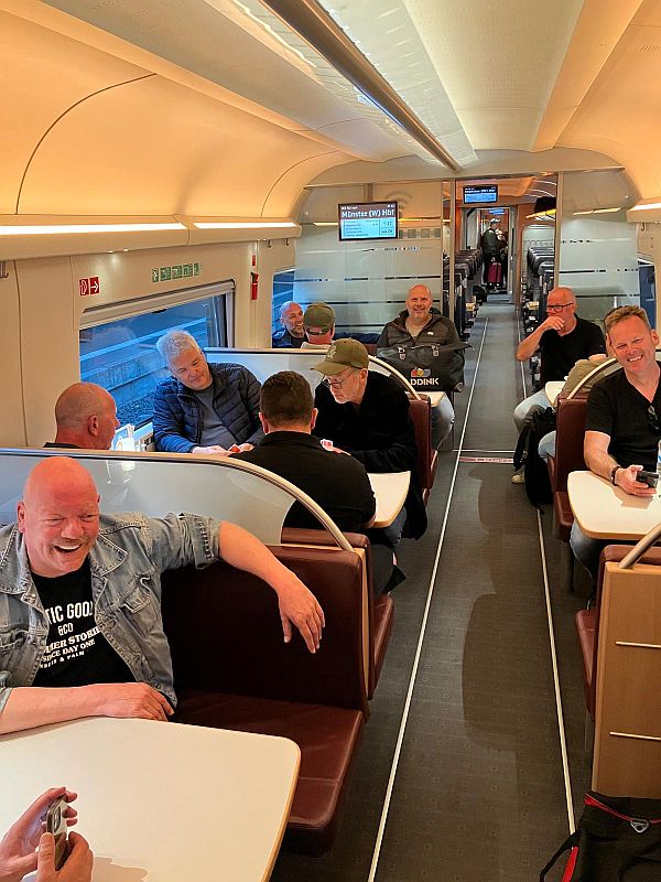 In Hannover moesten we nog een keer overstappen. Op perron 12 moesten we een half uur wachten op de trein richting Münster. Ineens werd dat perron 13 net aan de overzijde van het spoor, dat werd rennen want de trein reed al binnen. Met z’n allen in de restauratiewagon waar de stoelen neutraal zijn. Slim bedacht dus!