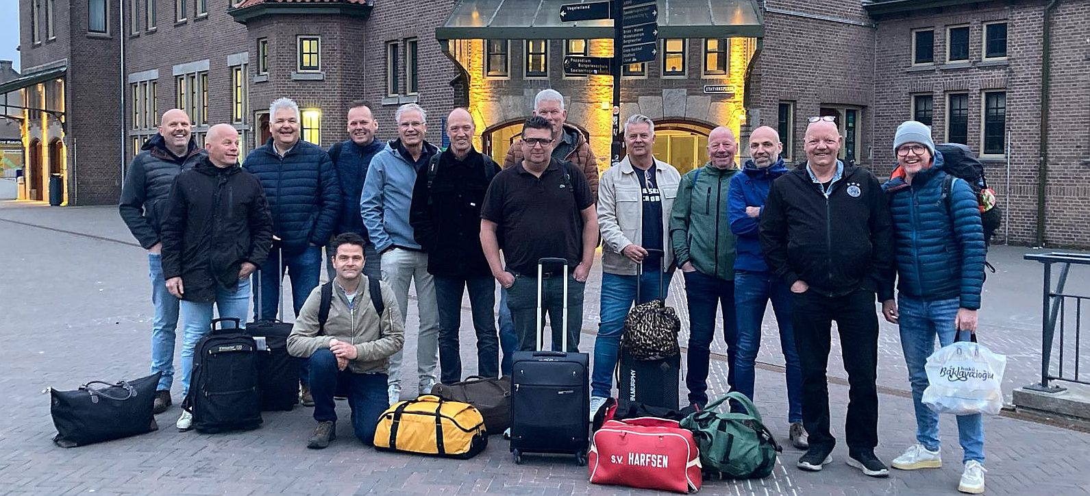 Helaas moest Hans K. afzeggen wegens andere verplichtingen. Michel V. en John B., die de vorige editie moesten laten schieten, complementeerden de selectie. Zo werd vertrokken met 14 man. Saillant detail John had zijn oude Sv Harfsen tas afgestoft, deze kon zo te zien nog net een ronde mee. Een aantal spelersvrouwen was bereid gevonden de heren op dit tijdstip op de trein te zetten. Op het Deventer station werd de groepsfoto geschoten en kon het avontuur beginnen. Een toevallig aanwezige conductrice was bereid om de toegangspoortjes alvast te openen. De toch al wat op leeftijd geraakte selectie was zo mooi op tijd op het juiste perron. Om 7.15 uur zat iedereen keurig in de trein. Met een overstap in Hannover en een omleiding bij Magdeburg verliep de reis voorspoedig. Rond 14.15 uur waren we op Haupt Bahnhof Berlin, daar nog even de dagpassen regelen voor het openbaar vervoer aldaar. Op naar het ZOE Hotel Berlin. Niet wetende dat je die pas eerst moet afstempelen, werd de reis naar het hotel zwart afgelegd. In het hotel werden de kamers verdeeld en medegedeeld wie met wie opgescheept zat.