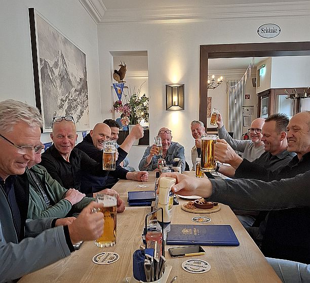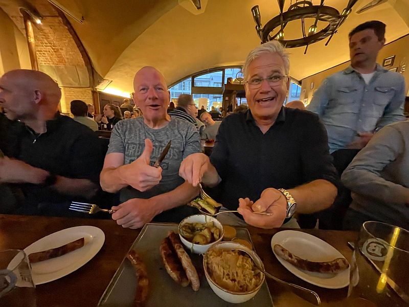 We zouden 5 biertjes proeven, helaas was het een flesje delen met 3 man. Daar ga je niet op de kop van naar buiten. Het laatste flesje bevatte 12% alcohol en stroperig als olie. Na de proeverij was de conclusie dat de brouwsels wat tegenvielen. De man werd bedankt voor bewezen diensten en gezegd dat het lekker was. Twee deuren verderop gingen we eten bij het restaurant van dezelfde eigenaar, ook Das Lemke geheten. De gereserveerde tafel stond klaar, na een korte bestudering van de kaart wilde iedereen Hirsch Gulash. De humorloze ober die de bestelling opnam, beende naar de de keuken en kwam terug met de mededeling dat ze niet zoveel hadden. De menukaarten werden opnieuw uitgedeeld. Welke Duitser is er niet groot mee geworden, Bratwurst und Sauerkraut. Dan maar dat!