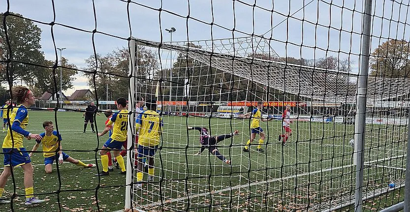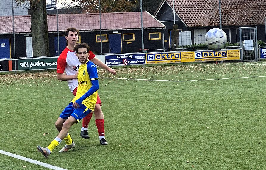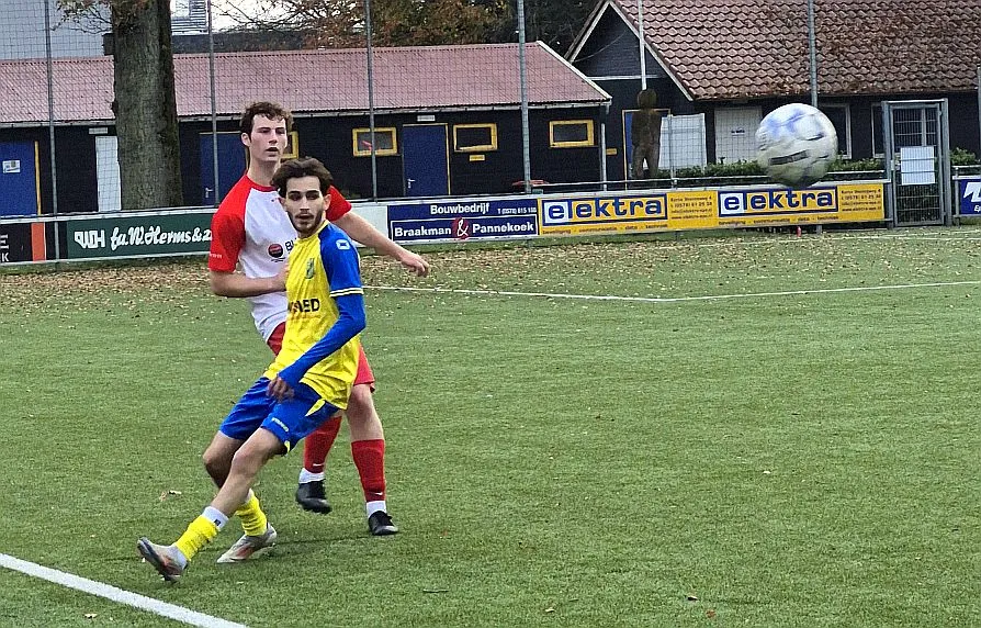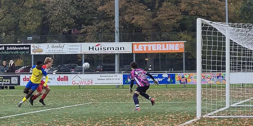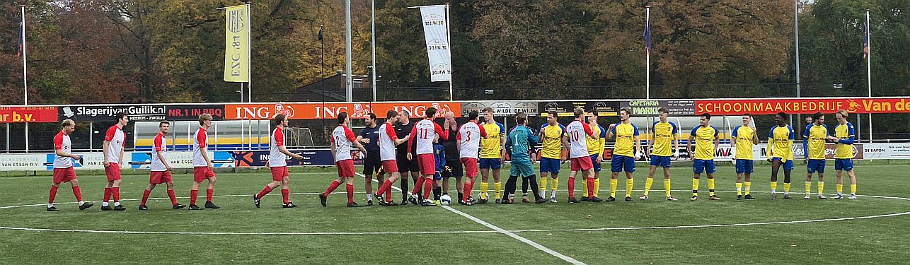 Harfsen trof vandaag een goede en felle ploeg in EZC'84. De gastheren speelden op het scherpst van de snede en maakten het Harfsen vanaf het eerste fluitsignaal moeilijk. Harfsen moest duidelijk wennen aan de felheid in de duels en liet zich in de eerste 10 minuten ietwat verrassen door de thuisploeg maar kwam daarna langzamerhand in het eigen spel. Het kreeg kansjes en na een kwartier leek Jochem de score te openen met een kopbal maar het was Dylan die het laatste zetje gaf en de 0-1 op het scorebord bracht. Het ging vervolgens over en weer en het kon in de eerste helft alle kanten op. Eerst was het EZC dat op 1-1 kwam na een snelle tegenaanval en daarna was het woord weer aan Harfsen dat via een terecht toegekende penalty opnieuw op voorsprong kwam (1-2). Dit was ook de ruststand ondanks het feit dat beide ploegen meerdere goede mogelijkheden kregen op meer goals waarbij Thom een paar keer goed zijn mannetje stond.