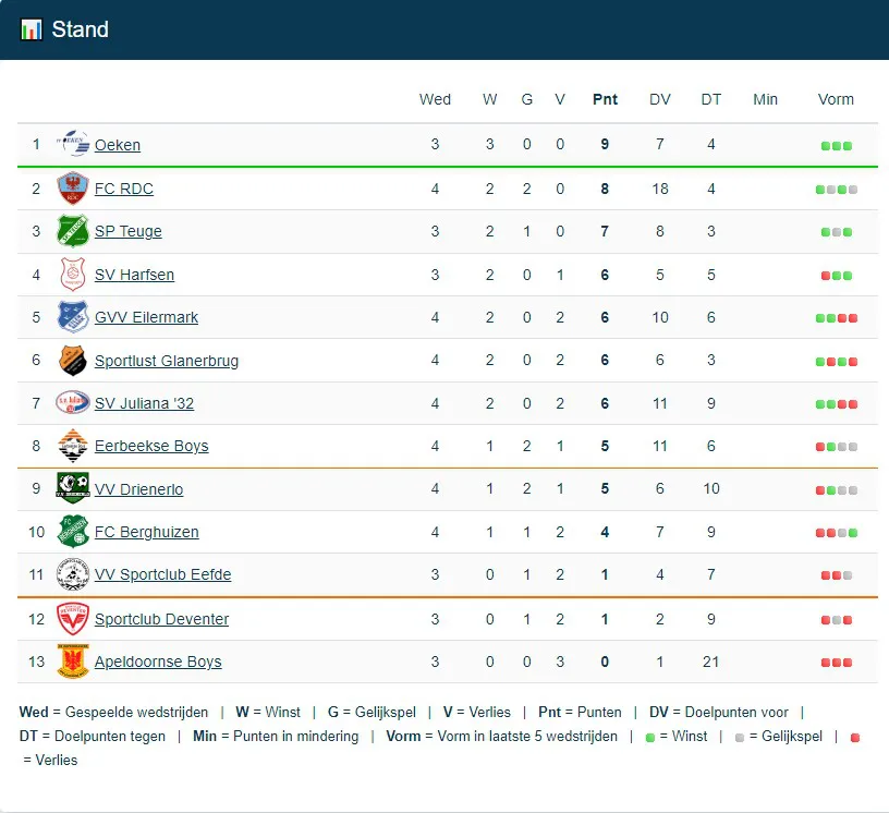 Maar wat een gezeur in de marge merkt u tercht op, als je met 3-0 wint. Want laten we niet vergeten, Harfsen doet het erg goed en vindt zich na deze wedstrijd terug in het linkerrijtje. De uitslagen gaan alle kanten op en alle clubs hebben al punten op Apeldoornse boys na. Volgende week is het herfst vakantie maar daarna (28 oktober) weer thuis, dan tegen Berghuizen.