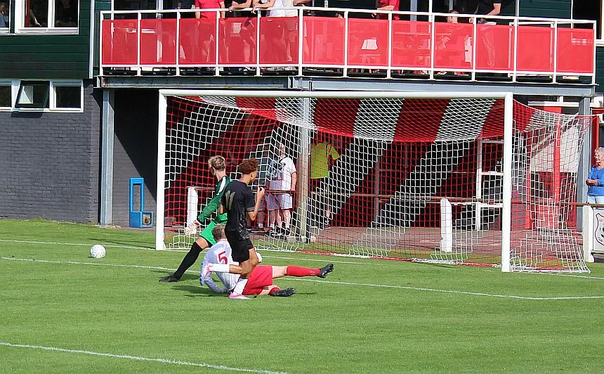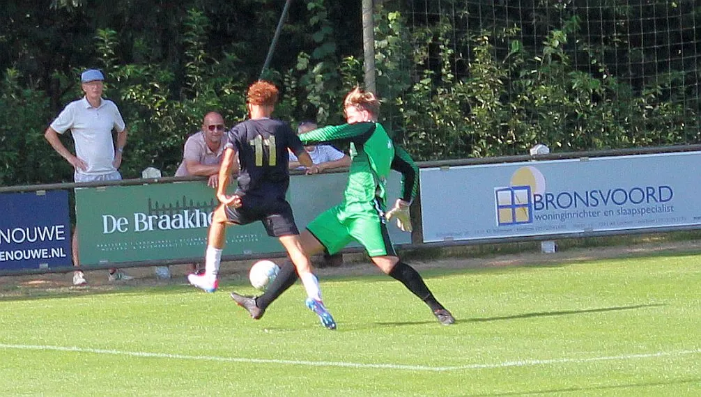 Nu is er geen houden meer aan, BQ gaat beter voetballen, krijgen nu ook meer ruimte op het middenveld en de vleugelspitsen worden steeds vaker binnendoor vrij gestoken richting het doel. Afwerken is nog wel een puntje. Telkens een aanraking te veel zorgt er voor dat Dylan en Jochem tijdig in kunnen grijpen. Er is een vrije trap voor nodig (slim geregeld door de ervaren aanvoerder) om de voorsprong weer op het bord te schieten. De vrije trap gaat dwars door de muur, dat mag natuurlijk niet, en Bas, toch ook niet kansloos, ziet de bal binnen gaan. Met nog 10 minuten te gaan staat de voorsprong voor BQ op het bord, 3-4.