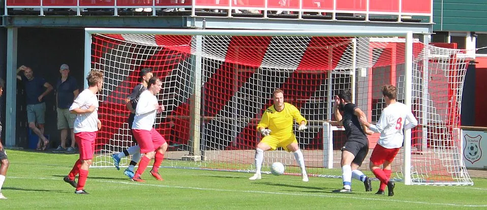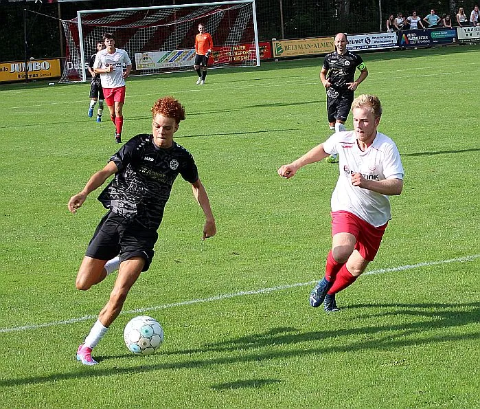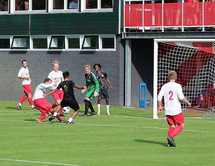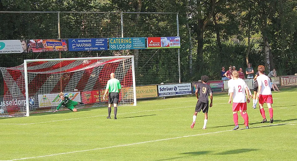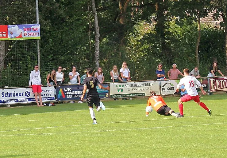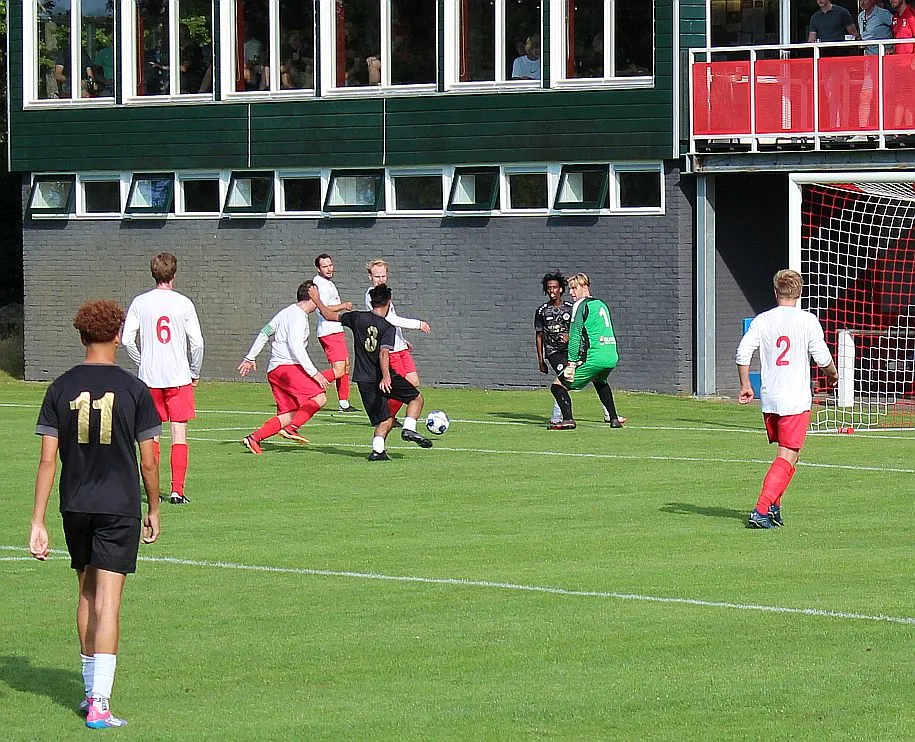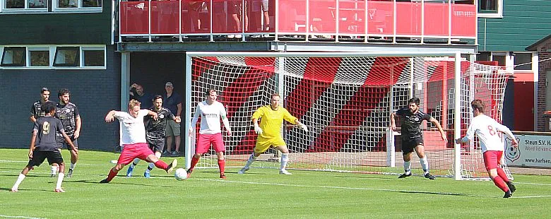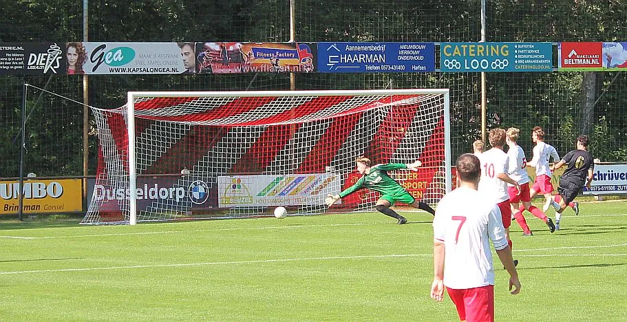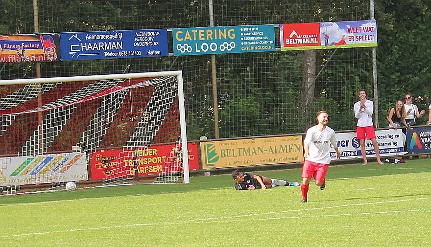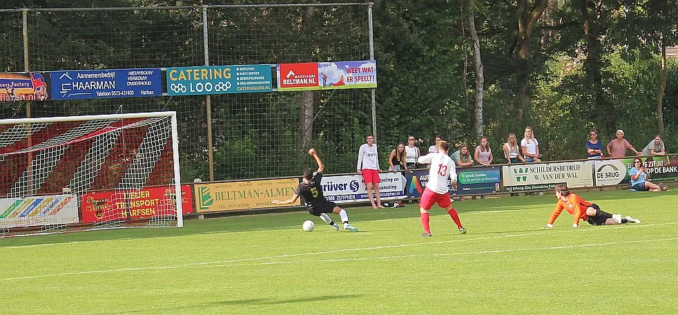 De Zutphense toeschouwers gaan er eens lekker voor zitten, die denken aan een monsterscore. De Harfsense toeschouwers genieten van de zon en het voetbal, technisch goed van beide kanten en elk doelpunt is een pré, maar natuurlijk wel het liefst voor Harfsen. Ze worden op hun wenken bediend. Luc komt door op rechts, trekt terug op Bram die een mooie schijntrap heeft waarmee hij verdediger en keeper fopt, met rechts trapt hij toch hoog in de korte hoek, 2-2. Wat een weelde, deze wedstrijd kan blijkbaar beide kanten op, we gaan er eens goed voor zitten.