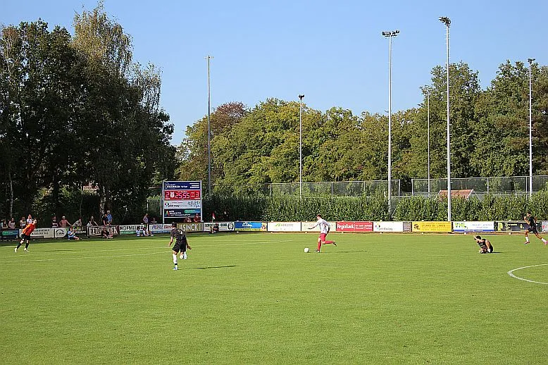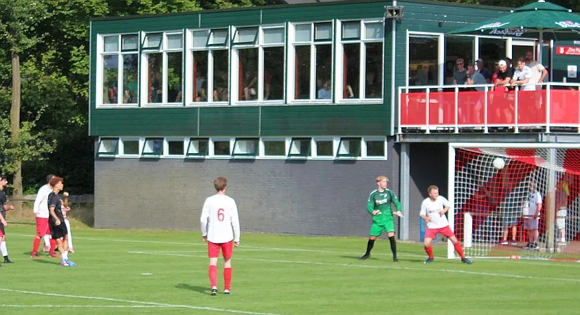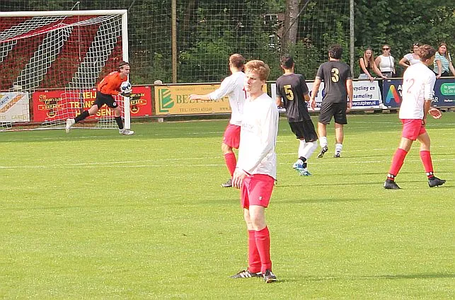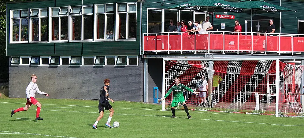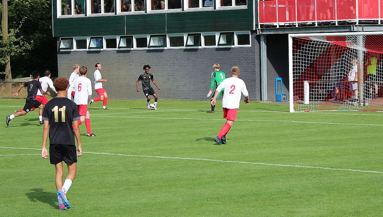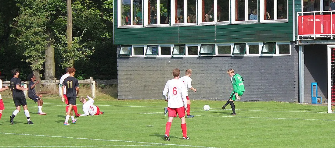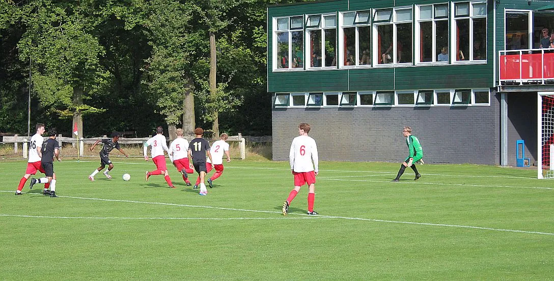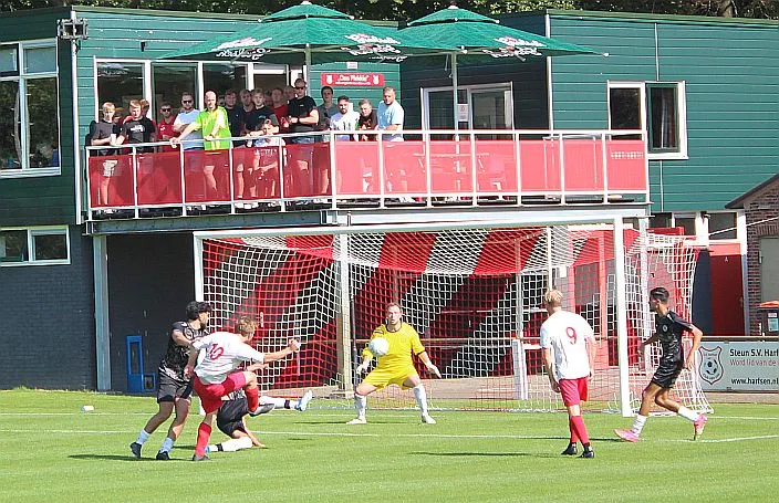 Het is drukkend warm als er afgetrapt wordt en langs de kant zit veel publiek. Veel ouders en supporters uit Zutphen, Harfsen ligt relatief dichtbij en het is goed toeven op het groene Schoolder. Harfsen laat zien dat ze zeker niet onder hoeven te doen voor deze jonge gastjes. Sterker nog, we komen op voorsprong als Jasper knap na 5 minuten de bal bij de tweede paal binnen schiet. Er is zelfs kans op meer, helaas gaat de volgende kans verloren.