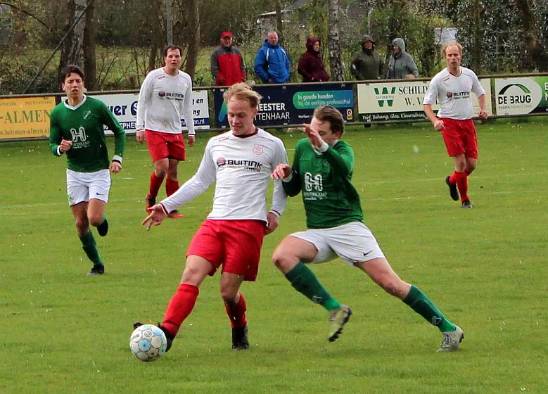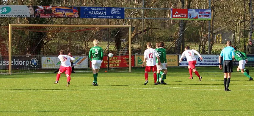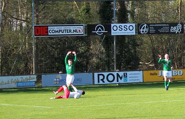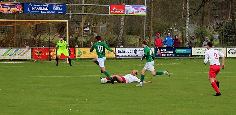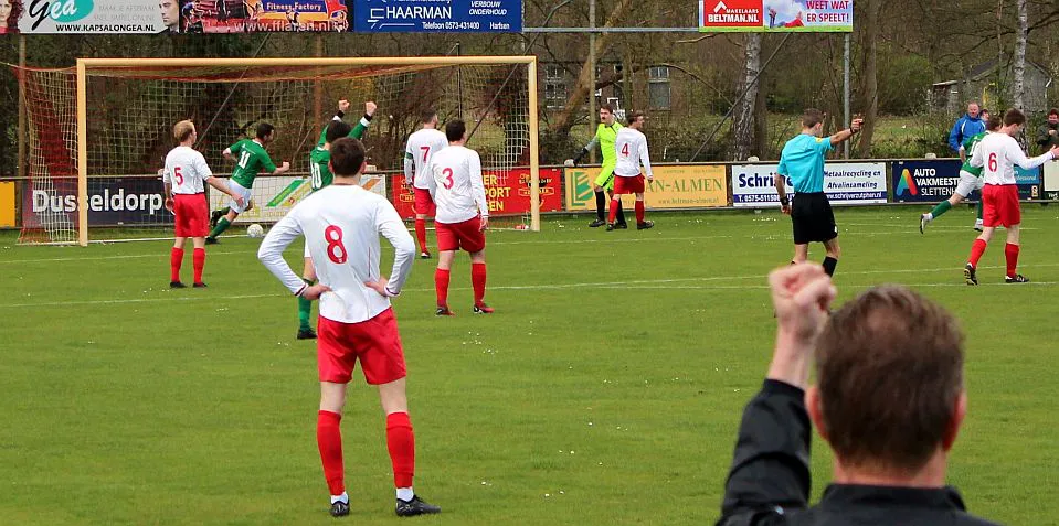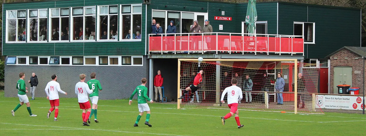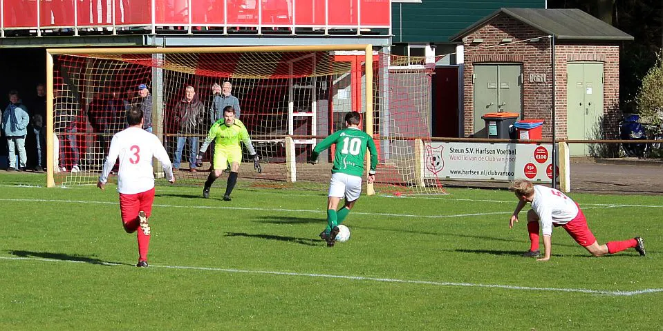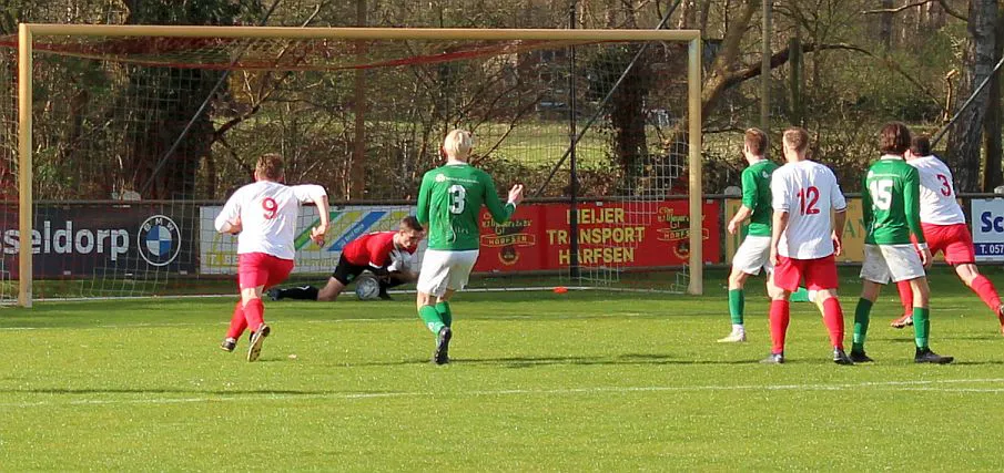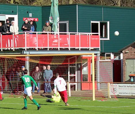 Komt er dan geen beloning voor het harde werken? Toch wel, Chiel krijgt een vrije trap te nemen, recht voor de goal. Zijn harde schot lijkt een makkie voor de keeper maar de bal is te hard, het verdwijnt tussen zijn benen door in de goal. De 1-2 is weliswaar een kwartier voor tijd maar die tijd blijkt niet genoeg voor de gelijkmaker. Harfsen valt aan, gooit er extra spitsen bij maar mogen blij zijn dat Teuge de score niet opschroeft. De counters van Teuge zorgen voor meer gevaar dan de hoge ballen die Harfsen bij Teuge in de trechter gooit. Het blijft dus 1-2 en Teuge pakt weer de winst. Ze liggen op koers voor het kampioenschap. Harfsen daarentegen moet oppassen om niet te degraderen. Volgende week tegen Eefde is cruciaal en daarna volgen wedstrijden tegen directe concurrenten. Als ze de strijdlust van vandaag weer kunnen brengen moet het goedkomen.