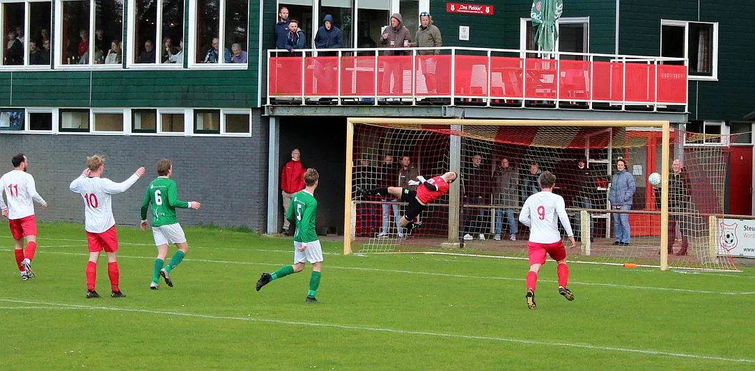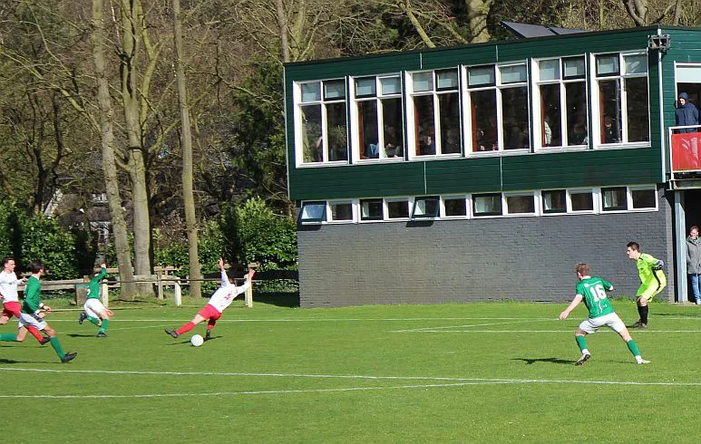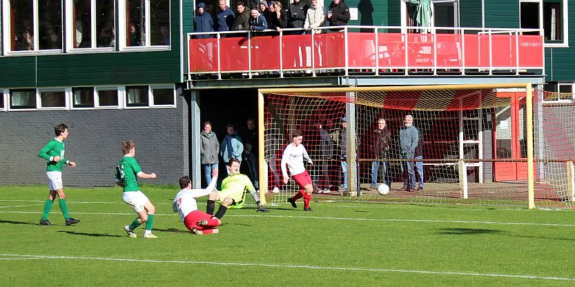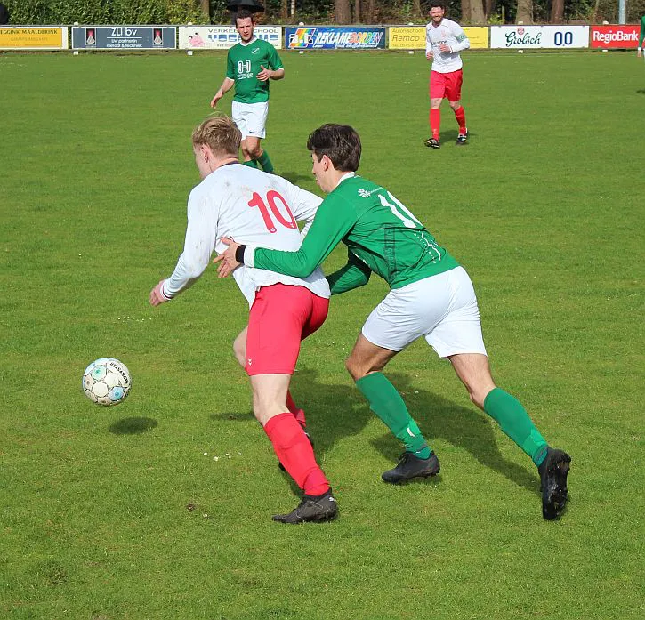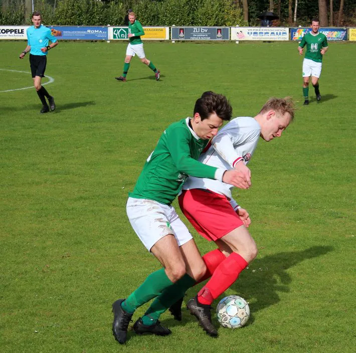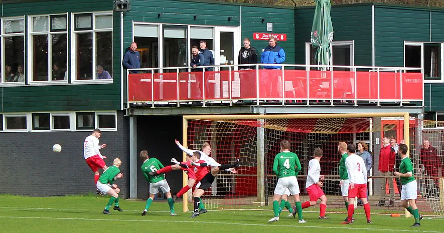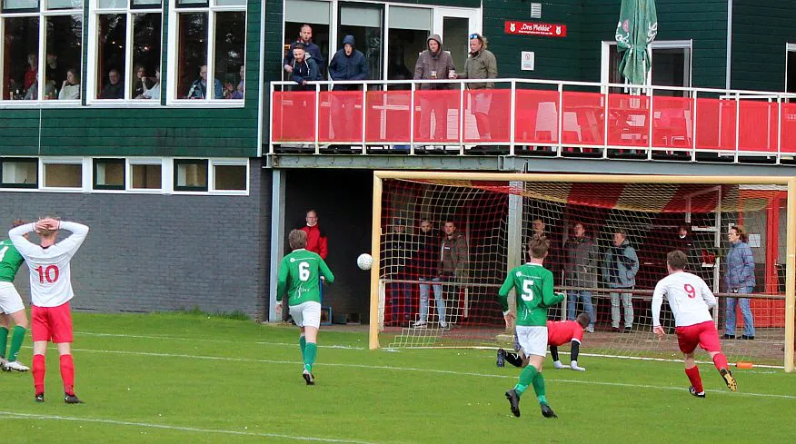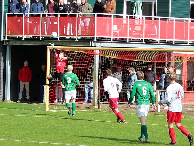Komt er dan geen beloning voor het harde werken? Toch wel, Chiel krijgt een vrije trap te nemen, recht voor de goal. Zijn harde schot lijkt een makkie voor de keeper maar de bal is te hard, het verdwijnt tussen zijn benen door in de goal. De 1-2 is weliswaar een kwartier voor tijd maar die tijd blijkt niet genoeg voor de gelijkmaker. Harfsen valt aan, gooit er extra spitsen bij maar mogen blij zijn dat Teuge de score niet opschroeft. De counters van Teuge zorgen voor meer gevaar dan de hoge ballen die Harfsen bij Teuge in de trechter gooit. Het blijft dus 1-2 en Teuge pakt weer de winst. Ze liggen op koers voor het kampioenschap. Harfsen daarentegen moet oppassen om niet te degraderen. Volgende week tegen Eefde is cruciaal en daarna volgen wedstrijden tegen directe concurrenten. Als ze de strijdlust van vandaag weer kunnen brengen moet het goedkomen.