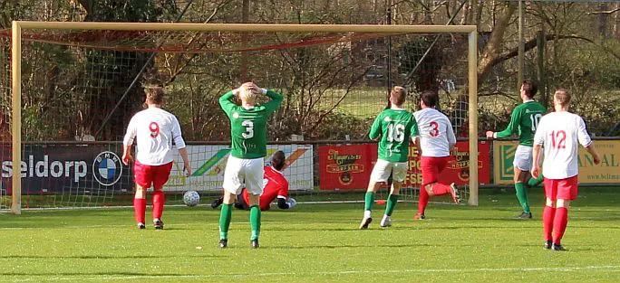 Harfsen probeert de gelijkmaker te forceren maar loopt daarbij tegen een fatale counter op. Teuge komt over links door en Paco ziet zichzelf tegenover drie aanvallers. De bal komt inderdaad bij de spits en dan is het simpel binnen schuiven, 0-2. Harfsen is inmiddels flink getergd en dan komen er extra krachten los. Als we eens kans hadden tegen dit Teuge te verslaan dan was het toch vandaag en daarom zetten ze nog eens aan. Luc duikt vanaf links de zestien in, dolt zijn tegenstander die eens onder de stokken van Luc door maait. Luc gaat tegen het gras maar de scheidsrechter staat er blijkbaar niet goed voor want die wuift de duidelijke strafschop weg. Zelfs de toeschouwers van Teuge begrijpen dat dit een foute beslissing is want zijn nu opvallend stil.