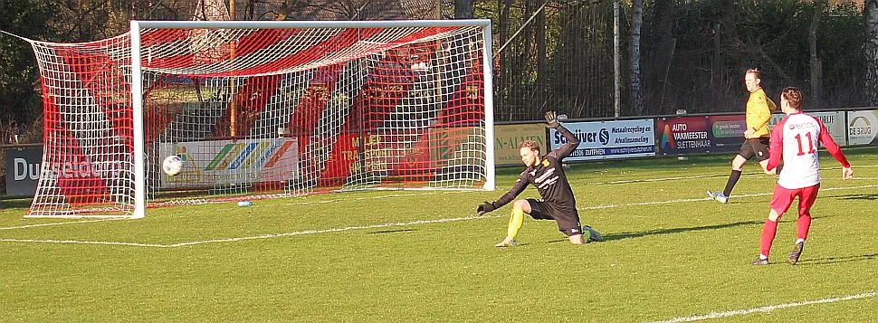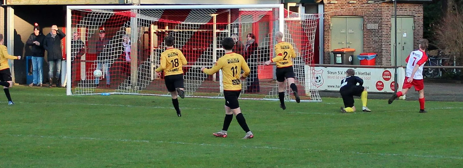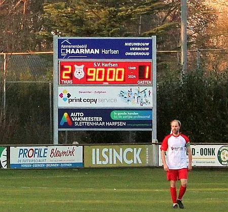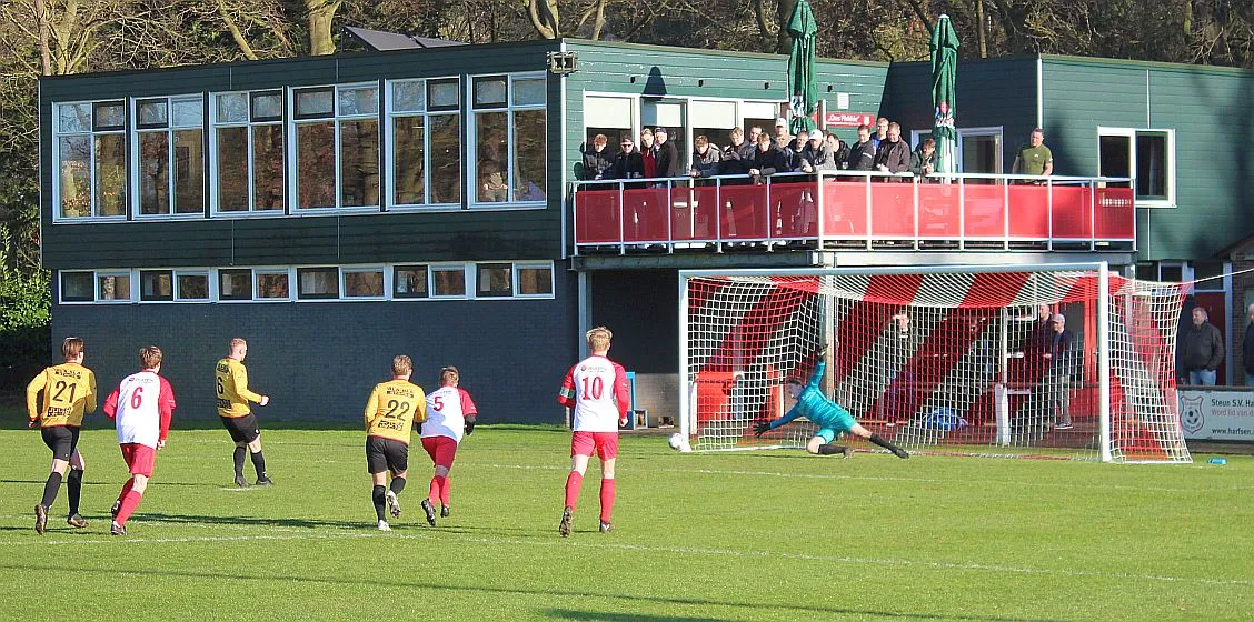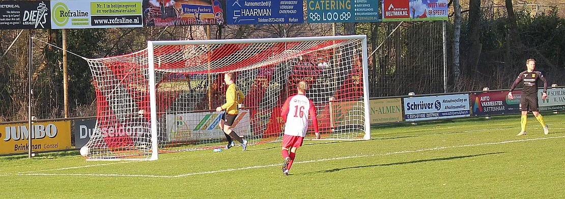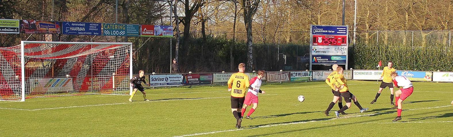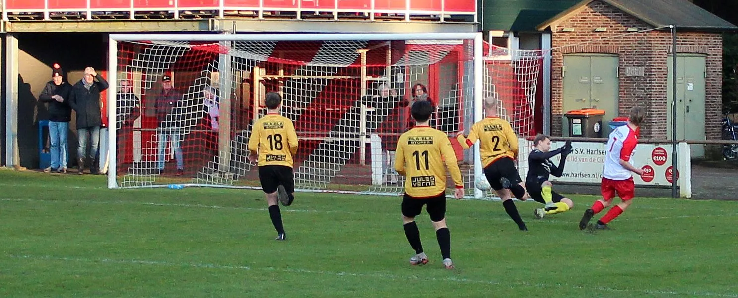Je voelt hem al aankomen, Apeldoornse Boys krijgen inderdaad nog een dot van nog een kans. De linkerspits haalt de bal vol op de pantoffel, alles of niets, en de bal gaat vol op de lat. Het doel trilt, Joost trilt, heel Harfsen trilt maar tot opluchting van de thuisploeg stuitert de bal weer het veld in. De scheidsrechter fluit af. Het is een benauwde overwinning maar de punten zijn binnen. Deze week maar eens trainen op shoot-outs.