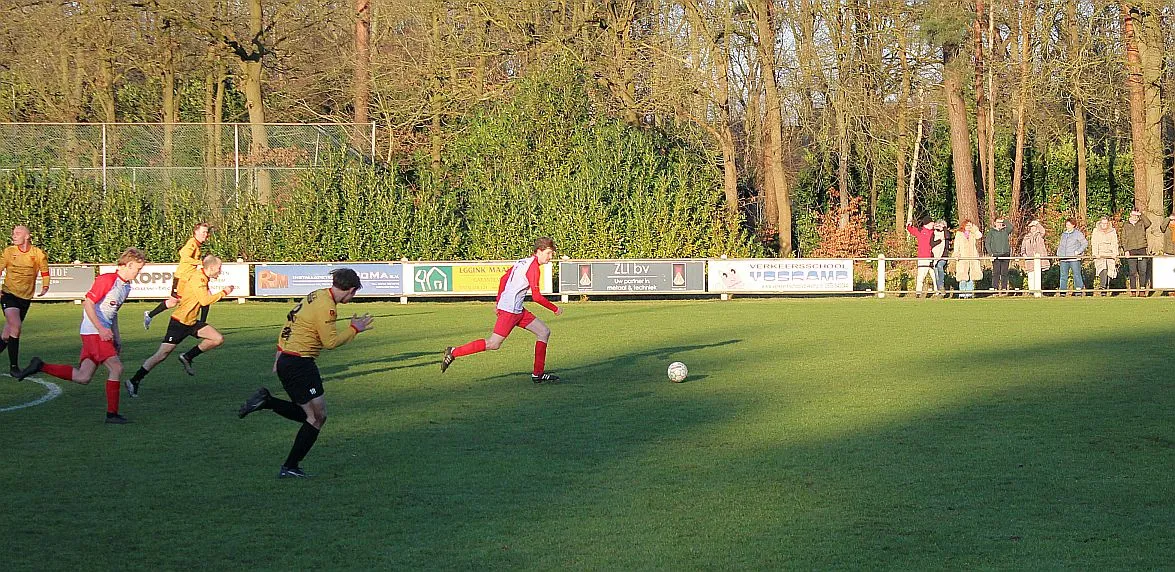 Harfsen wil door drukken maar mist opzichtig enkele kansen. Sven en Luc en Chiel en… enz. Sven is nog het dichtste bij met een schot op de paal. Tot frustratie van coach en publiek wil de voorsprong niet op het bord komen totdat in de 35e minuut Chiel een prachtige pass op Jochem in huis heeft. Jochem heeft een gaatje gezien dwars door het midden van de verdedigingslinie van de Boys. Hij neemt de bal op de borst rand zestien aan, neemt een paar stappen naar rechts en schiet diagonaal binnen, 2-1.