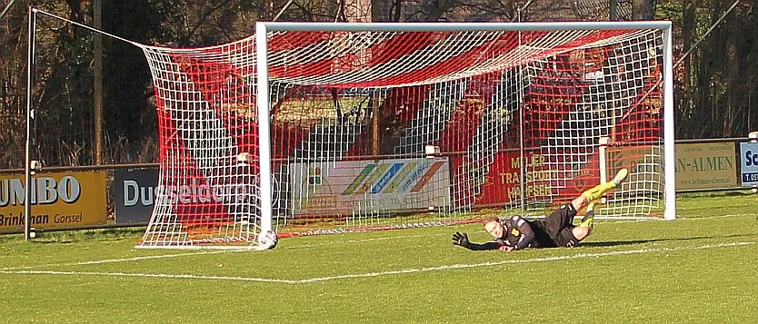 Het duurt 8 minuten als Apeldoorn de eerste kans krijgt. Het uitverdedigen van Luc is te doorzichtig, de rechterspits onderschept en snelt de zestien in, Luc in de achtervolging. Als de aanvaller de bal terug kapt komt het been van Luc nog eens onderdoor. Een klassiek geval van een terechte penalty. Die wordt vervolgens ook onberispelijk binnen geschoten, 0-1.