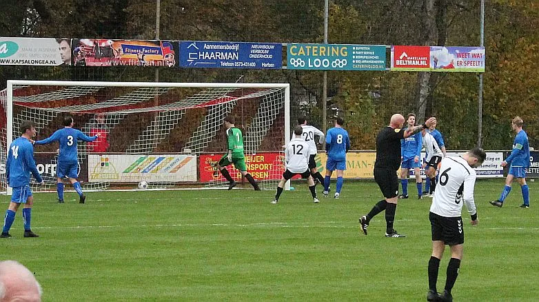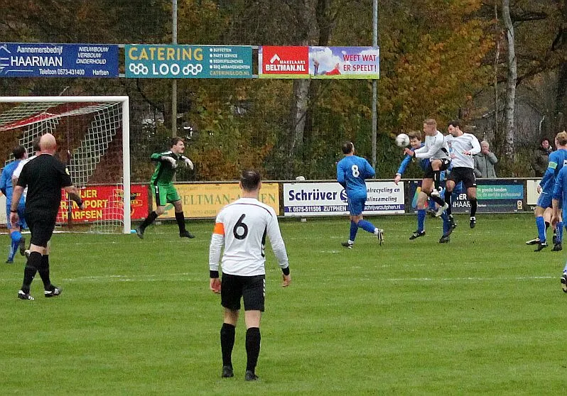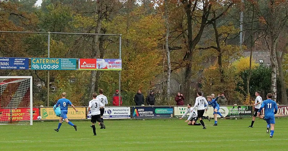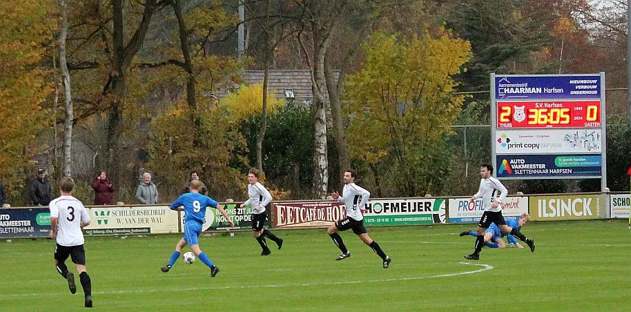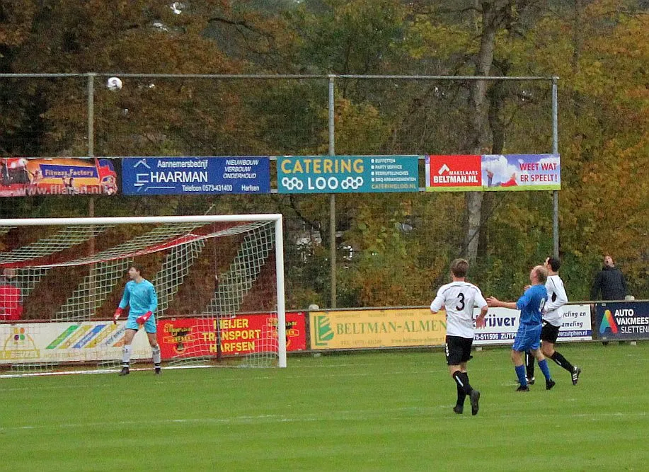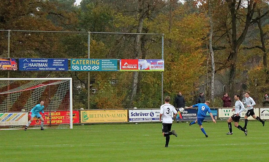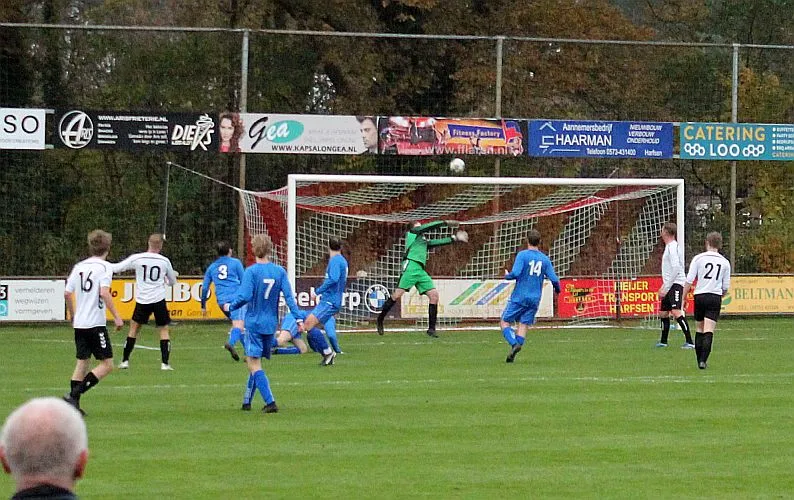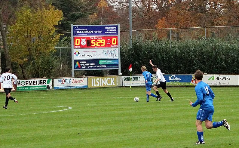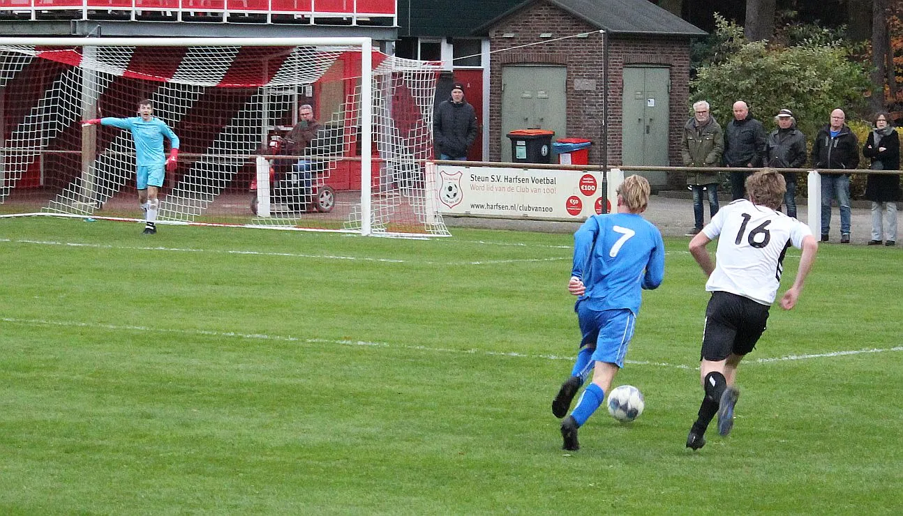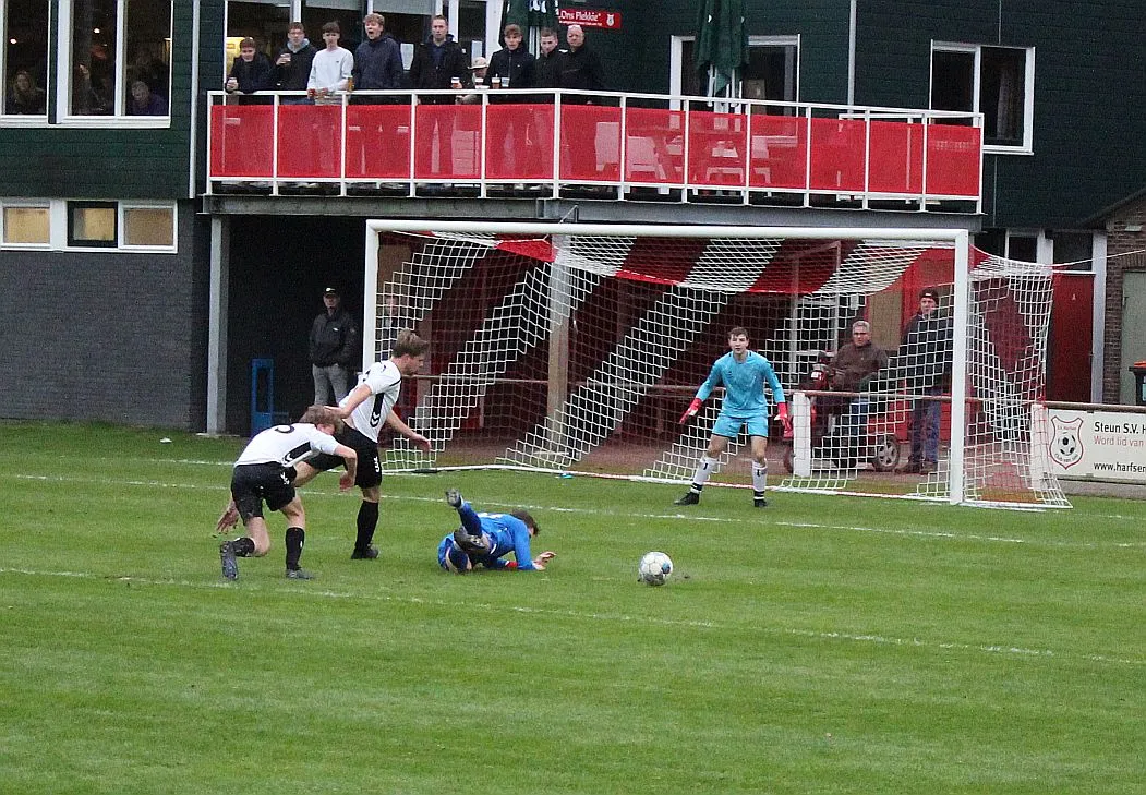 Maar als het moet dan herpakt Harfsen zich weer, de wedstrijd komt weer in evenwicht, het kan beide kanten op. Bram heeft twee kansen op rij, van dichtbij jaagt hij de bal met rechts net over het doel en even later met zijn linker trapt hij vol van de rand zestien de bal op onderkant lat. Die springt net voor de lijn omhoog zodat de keeper alsnog, uit eerst geslagen positie, de bal kan oppikken.