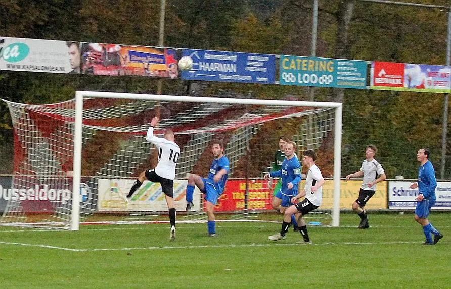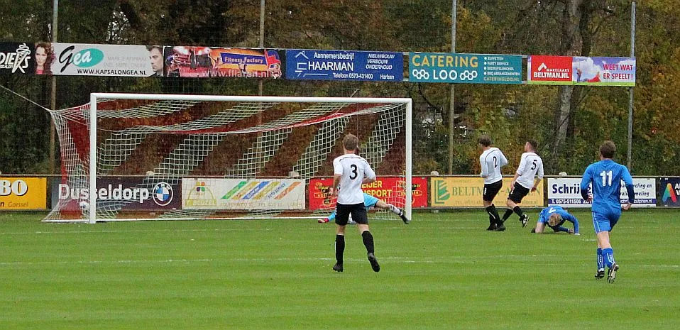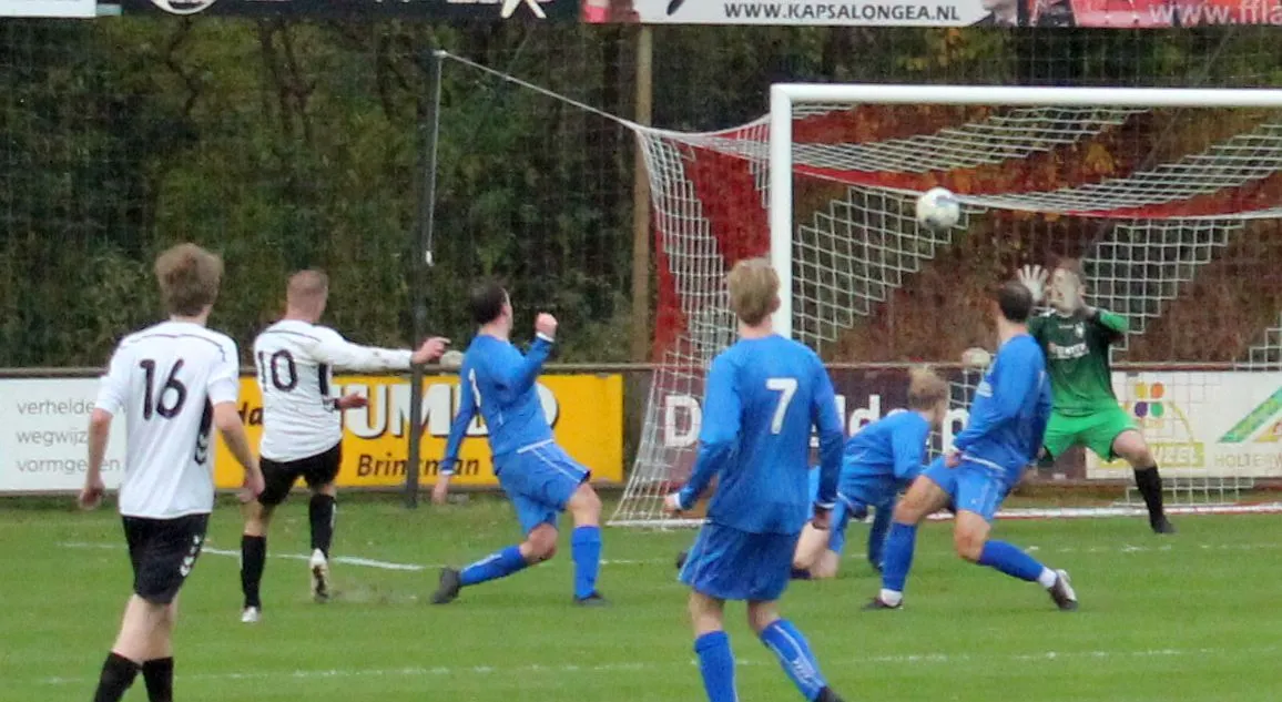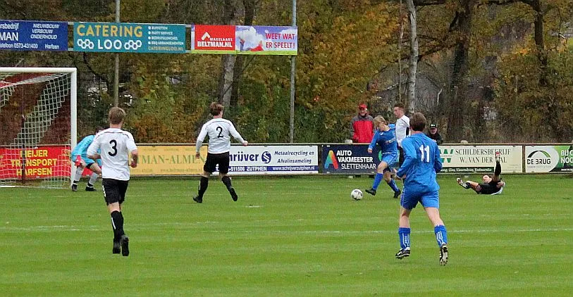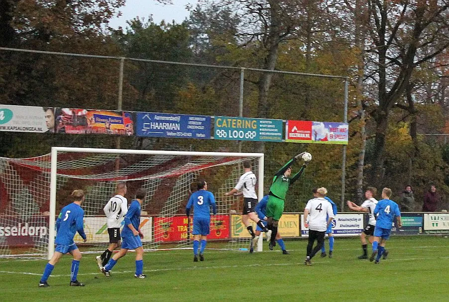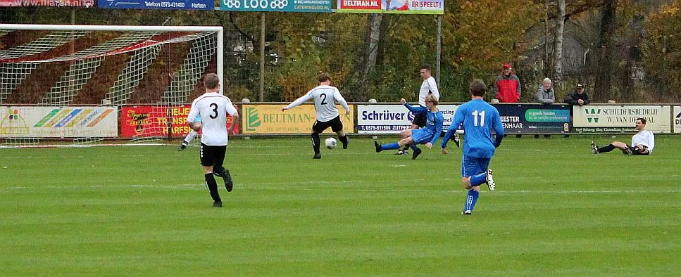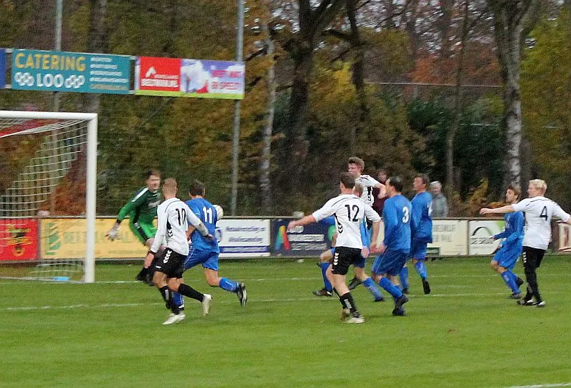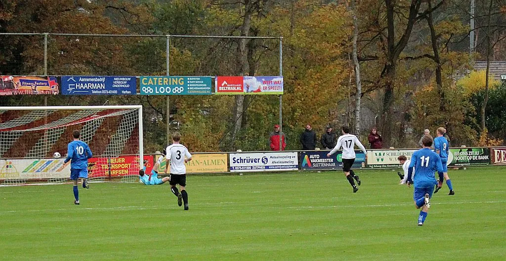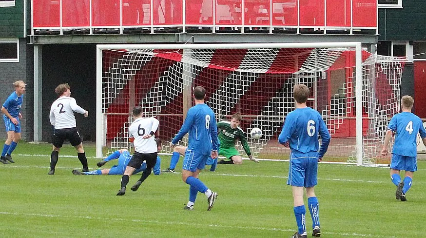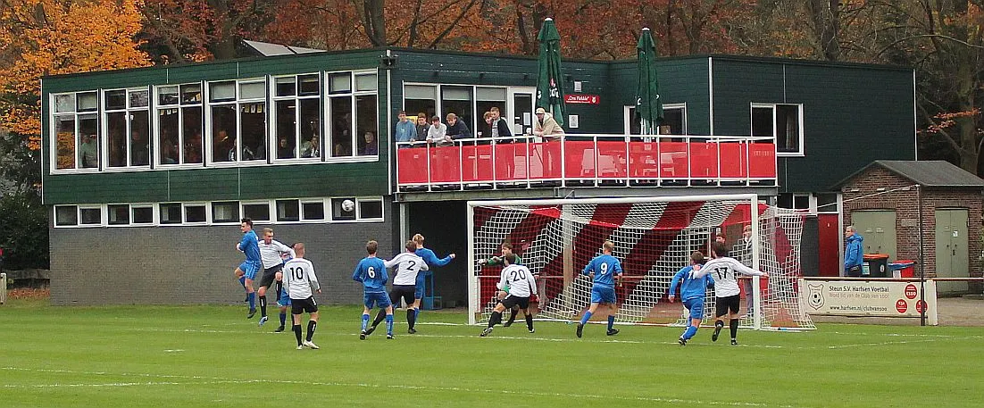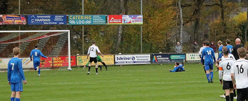 Maar als het moet dan herpakt Harfsen zich weer, de wedstrijd komt weer in evenwicht, het kan beide kanten op. Bram heeft twee kansen op rij, van dichtbij jaagt hij de bal met rechts net over het doel en even later met zijn linker trapt hij vol van de rand zestien de bal op onderkant lat. Die springt net voor de lijn omhoog zodat de keeper alsnog, uit eerst geslagen positie, de bal kan oppikken.