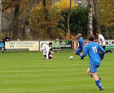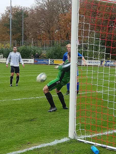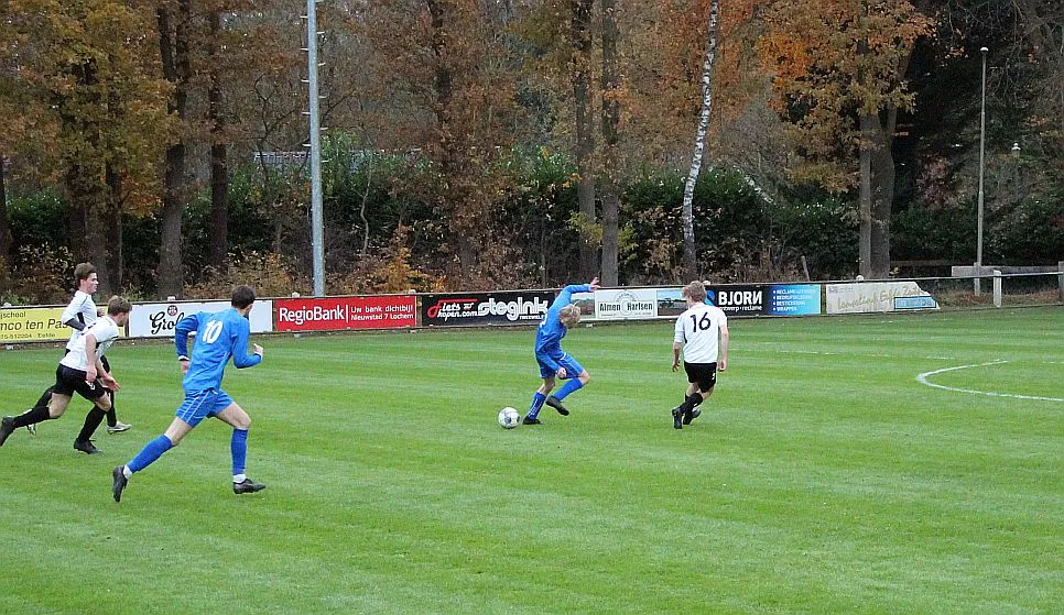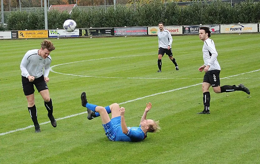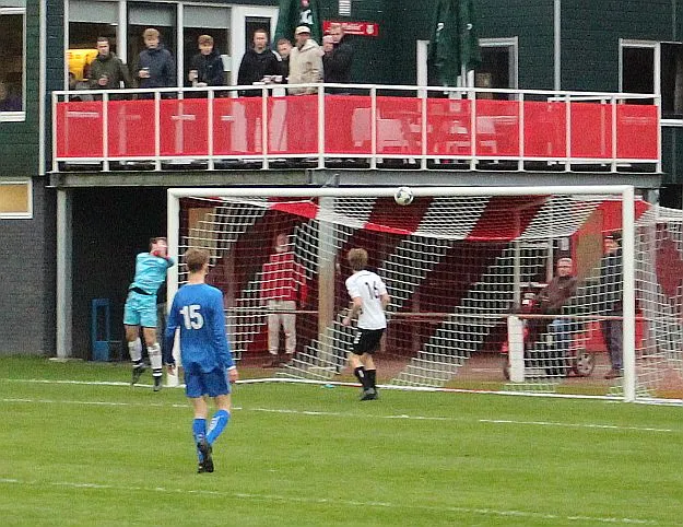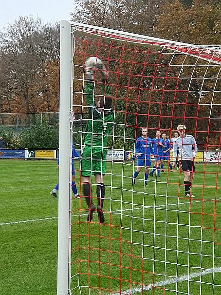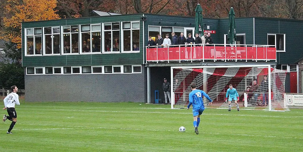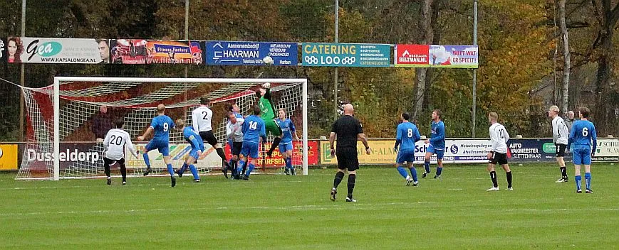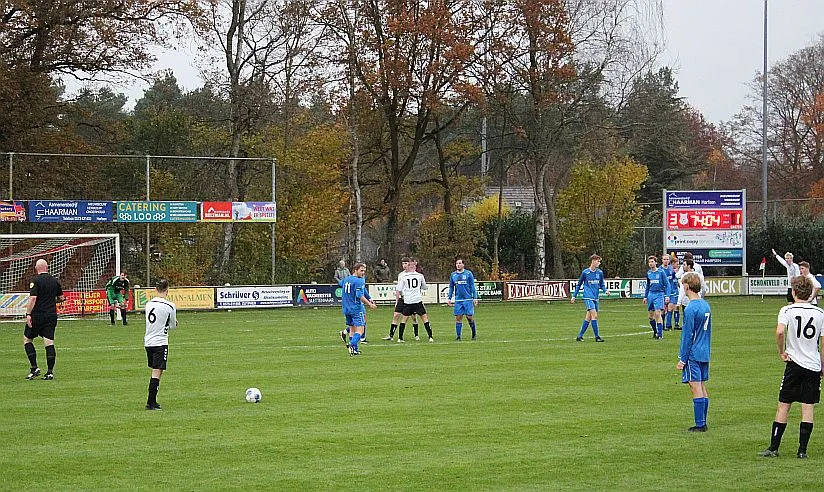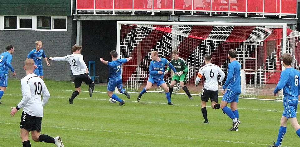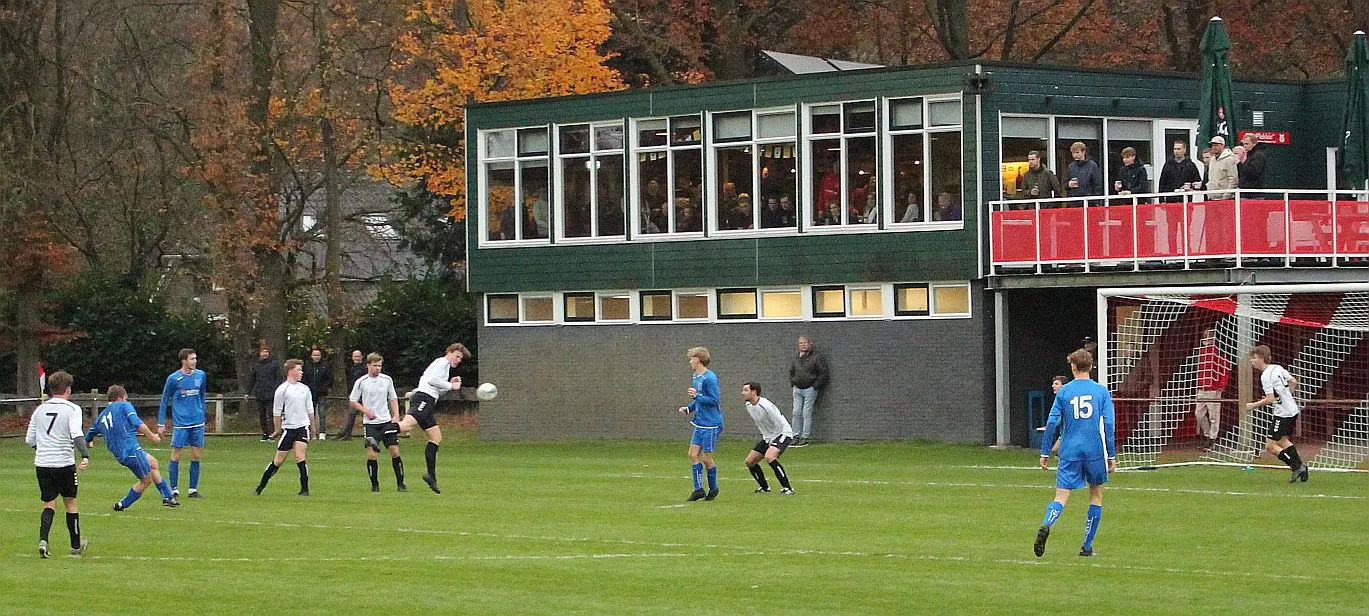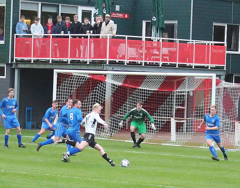 Maar als het moet dan herpakt Harfsen zich weer, de wedstrijd komt weer in evenwicht, het kan beide kanten op. Bram heeft twee kansen op rij, van dichtbij jaagt hij de bal met rechts net over het doel en even later met zijn linker trapt hij vol van de rand zestien de bal op onderkant lat. Die springt net voor de lijn omhoog zodat de keeper alsnog, uit eerst geslagen positie, de bal kan oppikken.
