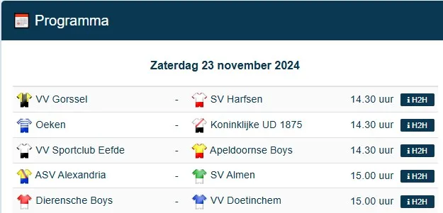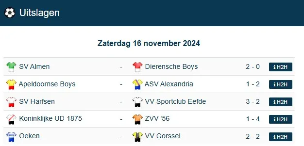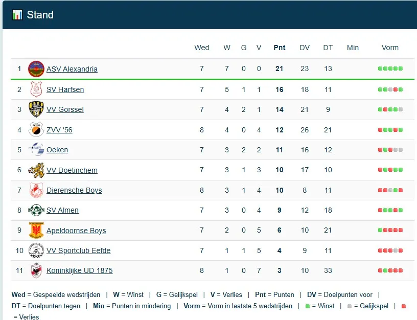In de competitie is het dringen in de top, Alexandria heeft daarbij toch goede zaken gedaan vorige week en staat los van Gorssel en Harfsen en kan volgende week nogmaals in de handen wrijven als die twee clubs tegen elkaar moeten. Maar goed, het seizoen is nog lang er kan nog van alles gebeuren. Eerst moet Harfsen maar eens zien te winnen van Eefde want derby’s kennen eigen wetten, deze is niet zomaar gewonnen.