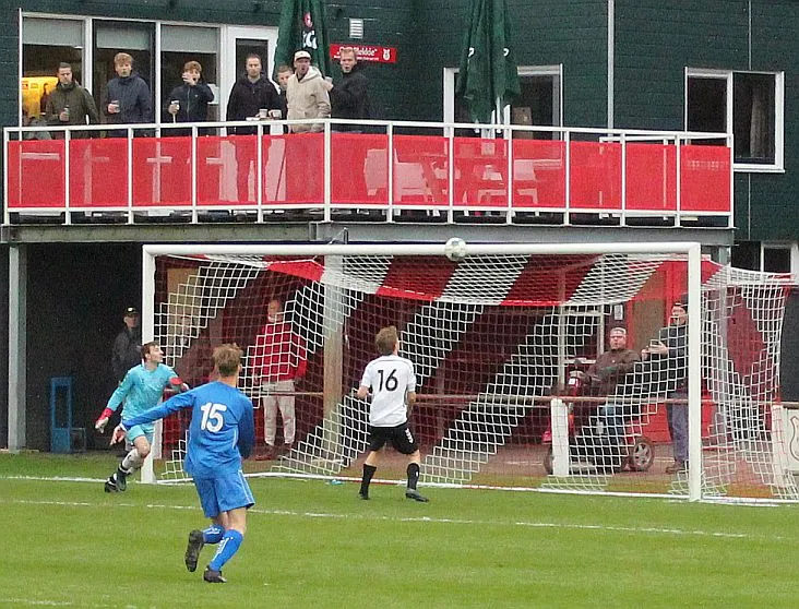 Harfsen pakt het weer op en vertrouwd vandaag op de man in vorm; Sven. Die is weer over rechts weg, glipt weer langs zijn man, kan misschien voorleggen maar gaat buitenom en schiet via de paal in het zijnet.