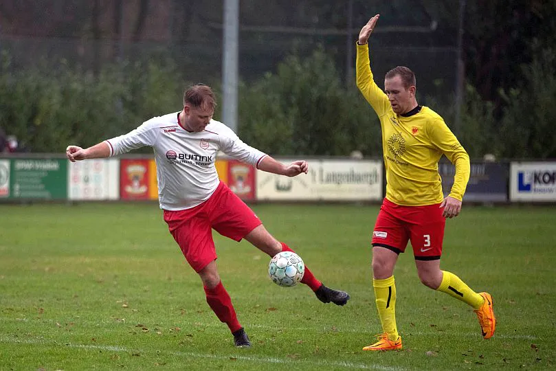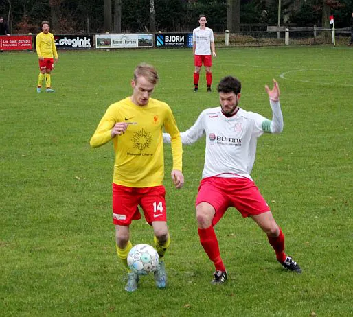 Peter Zoetbrood (links) was zaterdag tegen Apeldoornse Boys goed voor twee van de drie treffers namens Harfsen. foto © Ruben Meijerink