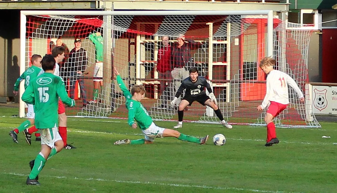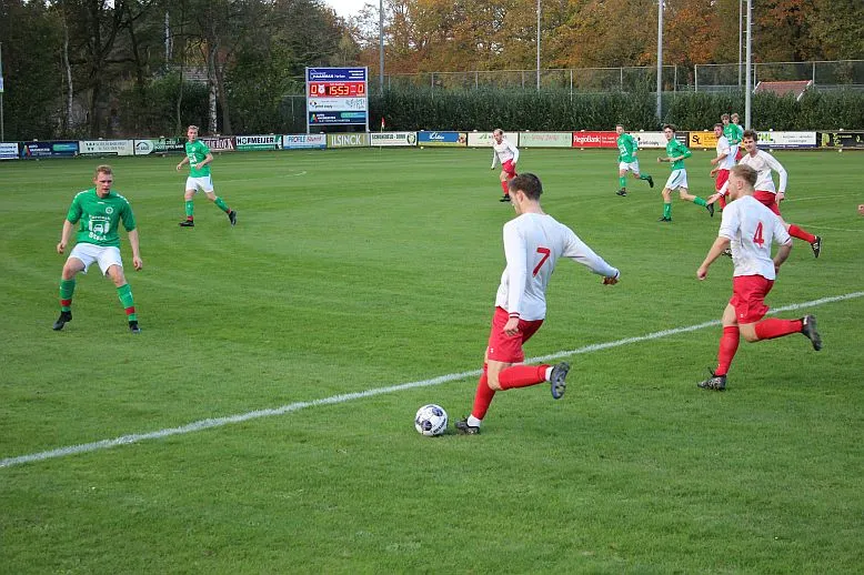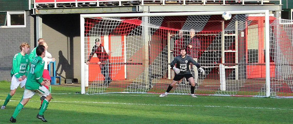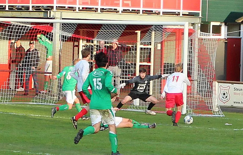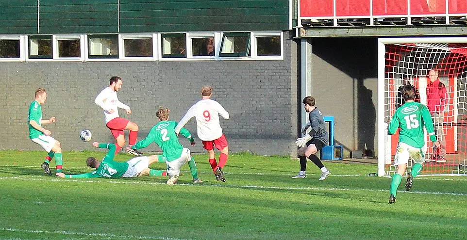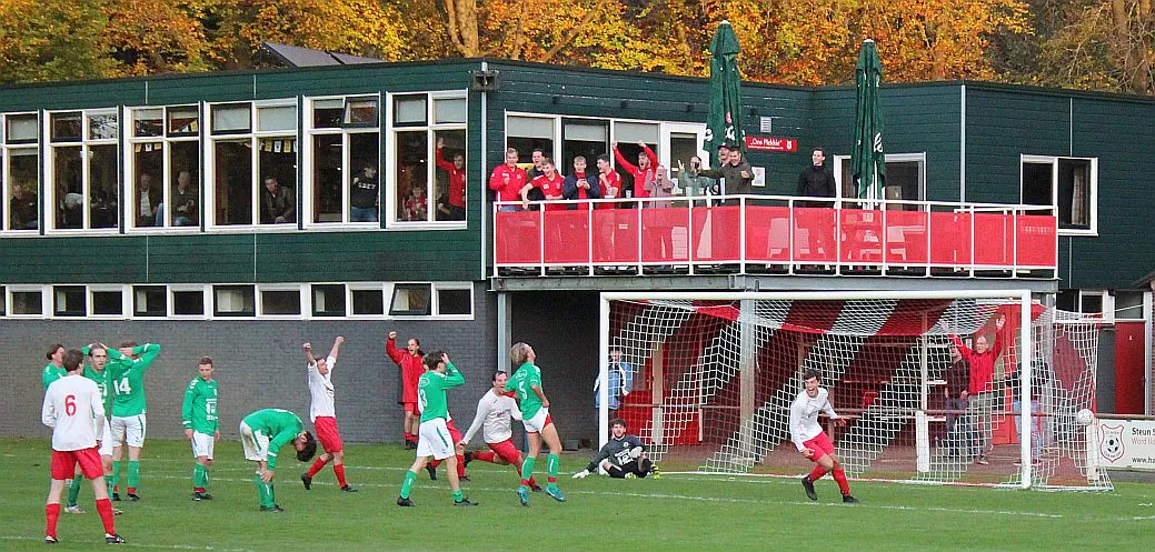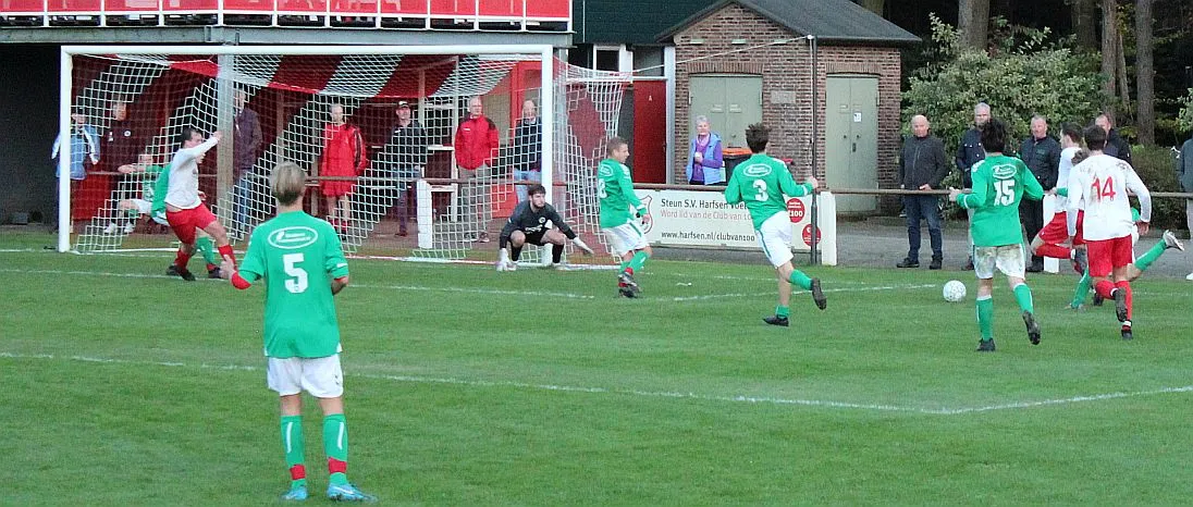 Harfsen ruikt bloed bij de aangeslagen gasten en hoewel de wedstrijd al in blessuretijd is, er is nog tijd voor een aanval. Chiel komt door over rechts, haalt de achterlijn tot bij de 5 meter lijn, legt terug op Dylan, die kan schieten maar kiest voor Sven die helemaal vogeltjevrij staat, de publiek houdt de adem in… het beeld gaat nu in slow motion…. Sven wil met rechts schieten.. maar nee… de pass is niet zuiver… struikelt half… kan toch nog met links inschieten.. en als de slow motion weer overgaat in live action blijkt de bal op de doellijn gestopt door de keeper en de verdediger. De ultieme kans om de wedstrijd te stelen gaat verloren en het blijft bij 1-1.