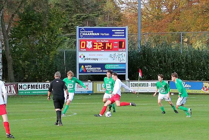 Harfsen heeft moeite met de laatste pass en moeite om koelbloedig te blijven. Net een aanname te veel, een stap te veel, m.a.w. te veel tijd nodig om te komen tot een schot of de verdediging en keeper Boys zitten er weer tussen. Harfsen voert de druk verder op, coach Elders stuurt voorstopper Dylan naar voren voor extra kopkracht. We hebben weer de klasse nodig van Chiel, de Cole Palmer van Harfsen en zijn magische linkervoet, de eerste vrije trap schiet hij echter in de muur.