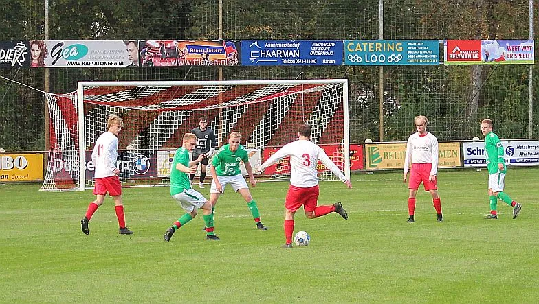 Dierense Boys heeft een jong team die duidelijk door de trainer met een strijdplan met de bus naar Harfsen zijn gestuurd. Aangemoedigd door veel eigen fanatieke toeschouwers (niks mis mee overigens) begint het team met veel energie aan de wedstrijd tegen de koploper. Harfsen wordt gelijk vast gezet en heeft wat moeite om daar onderuit te voetballen. Hierdoor is het spelbeeld voornamelijk op de helft van Harfsen, overigens zonder noemenswaardige kansen voor de gasten. Maar ook thuisploeg Harfsen komt tot weinig kansen. De beste is dan toch voor Luc V. Sven komt door tot op de achterlijn, trekt hem terug op de 5 meter waar Luc op melkbussenhoogte intikt. Prima uitvoering, echter de keeper van de Boys is alert, staat goed opgesteld en weet te stoppen.