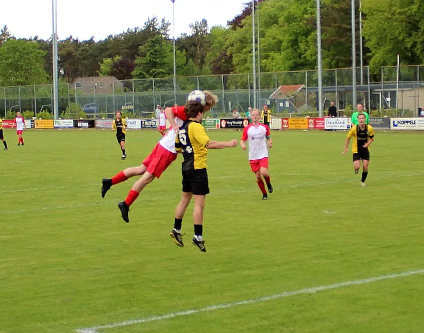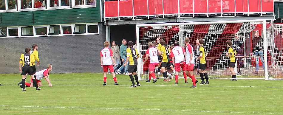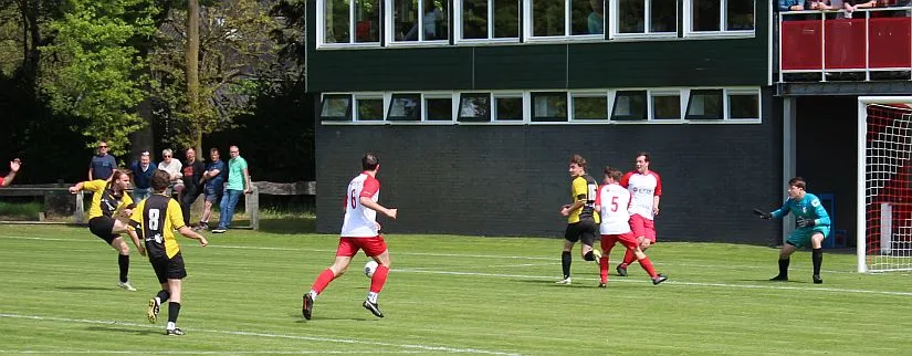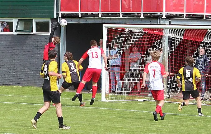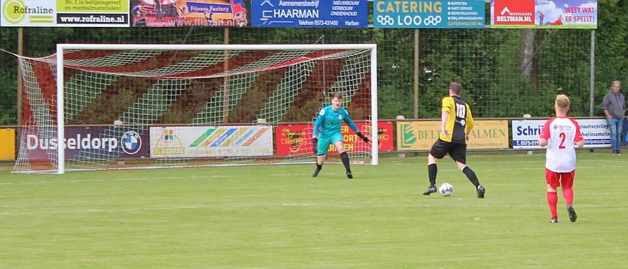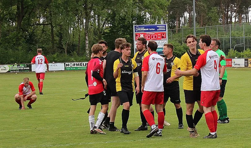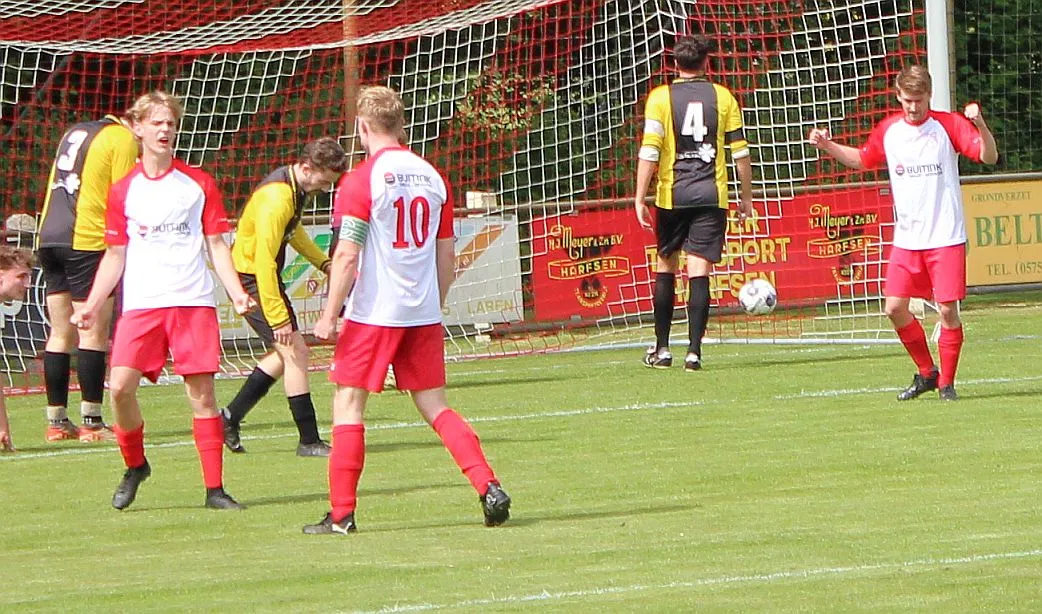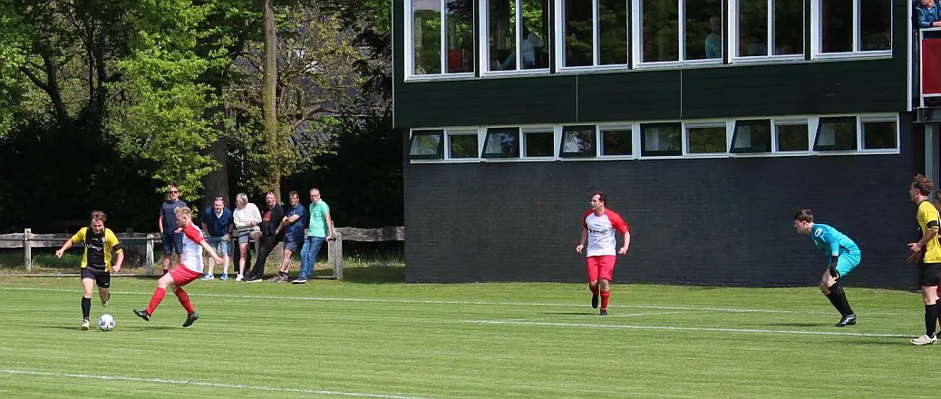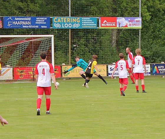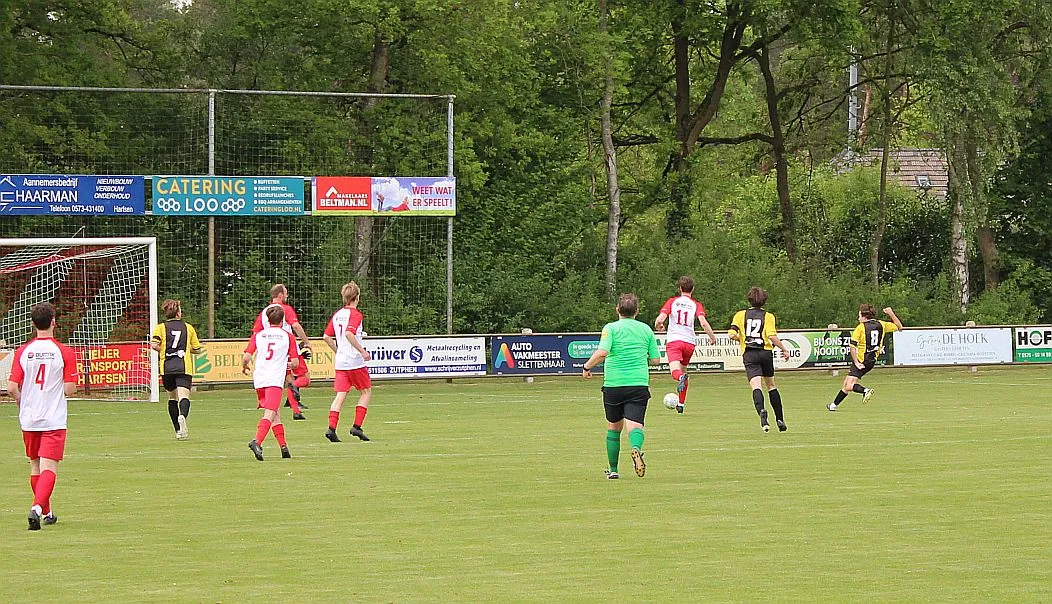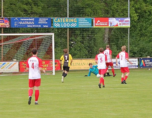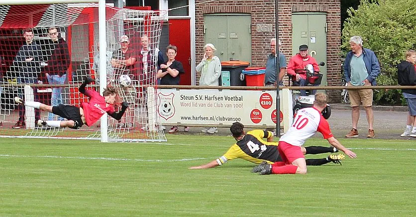 Harfsen speelt natuurlijk een verloren wedstrijd maar gaat toch vol op de aanval en zet extra spelers voorin. In de drukte kan Jochem vogelvrij de hoekschop binnenkoppen en hij bepaald daarmee de eindstand op 2-4.