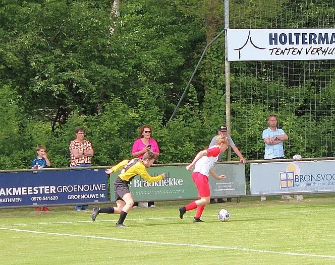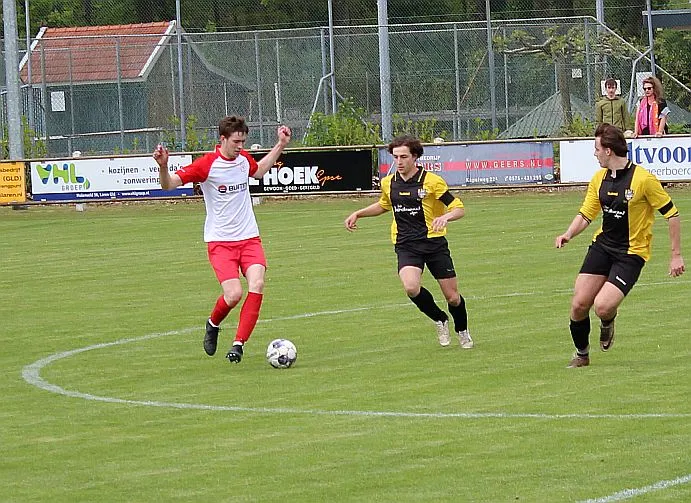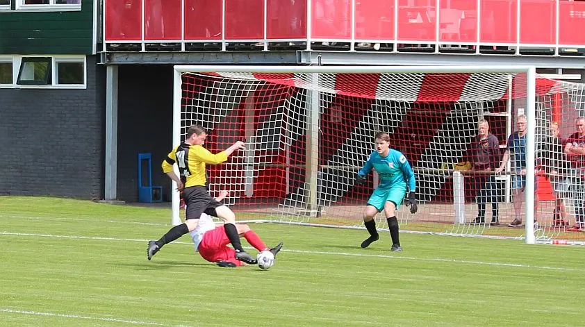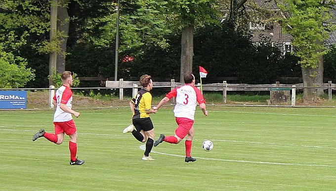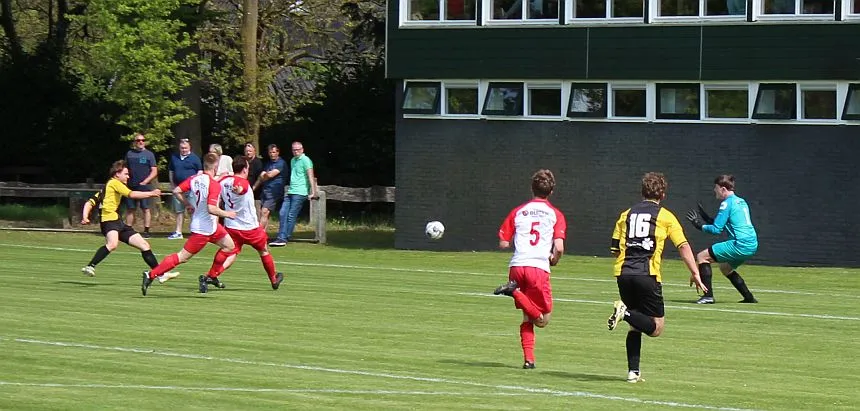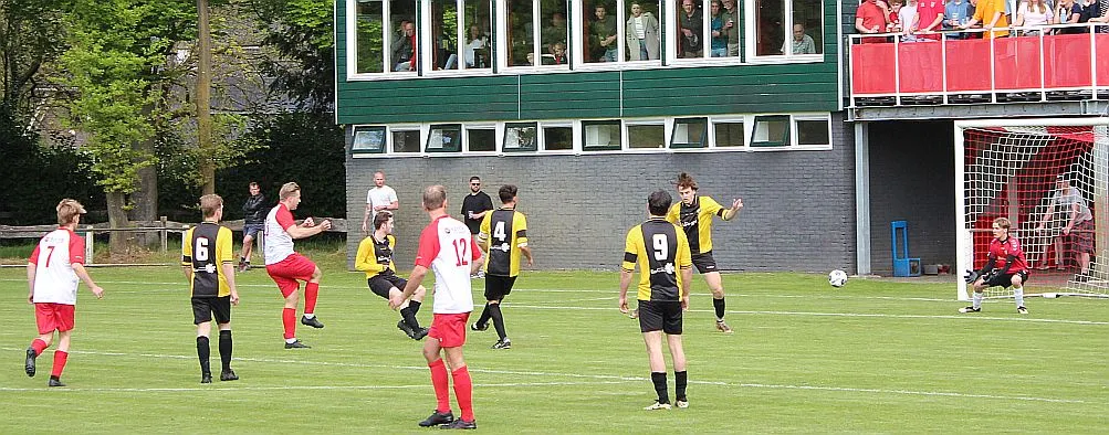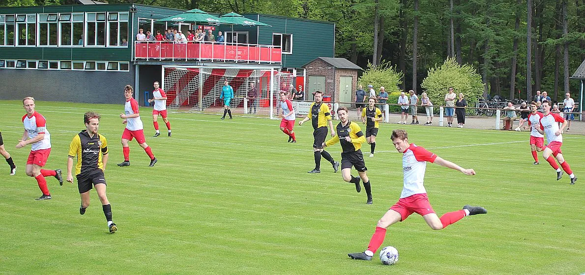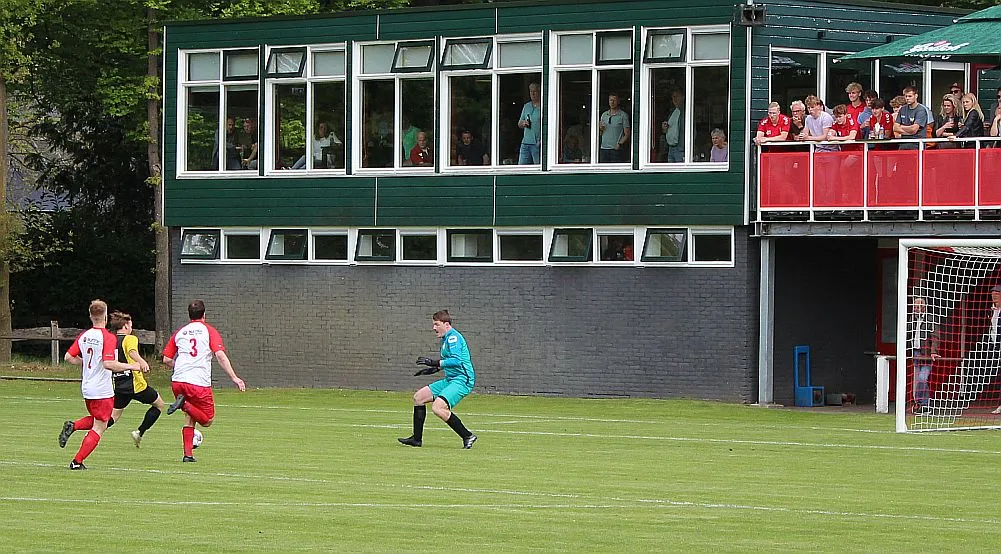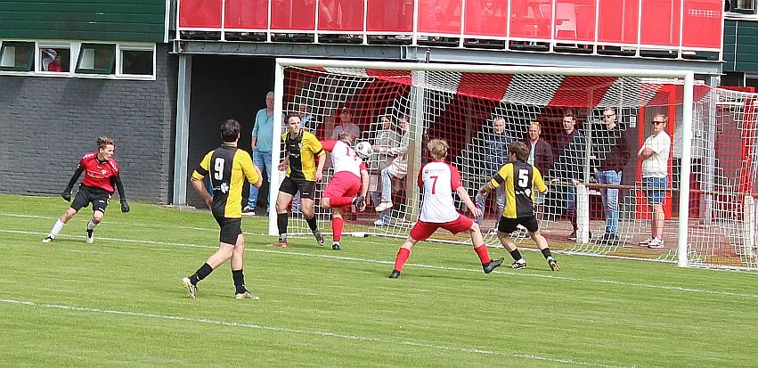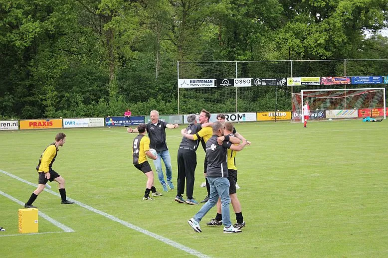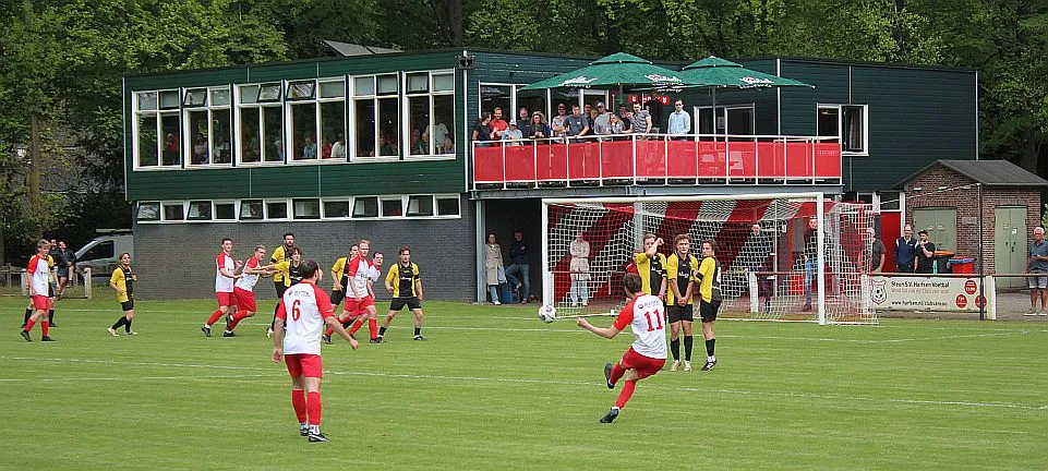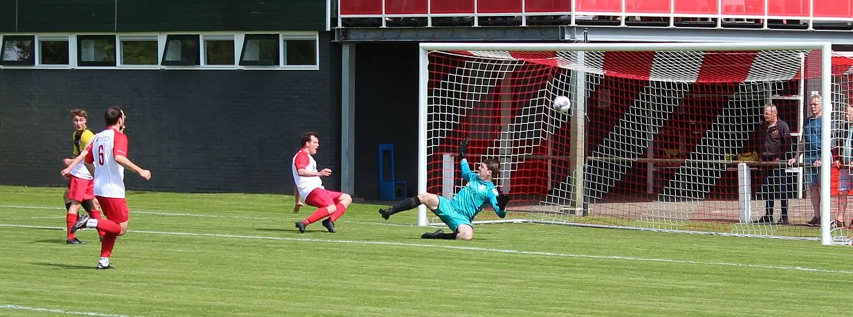 Harfsen speelt natuurlijk een verloren wedstrijd maar gaat toch vol op de aanval en zet extra spelers voorin. In de drukte kan Jochem vogelvrij de hoekschop binnenkoppen en hij bepaald daarmee de eindstand op 2-4.
