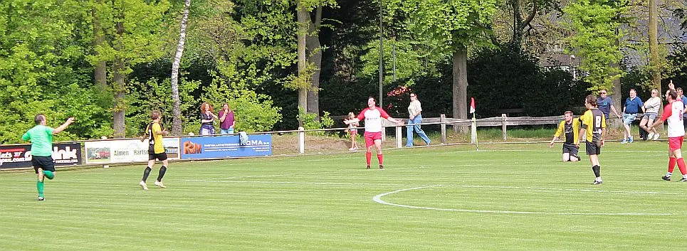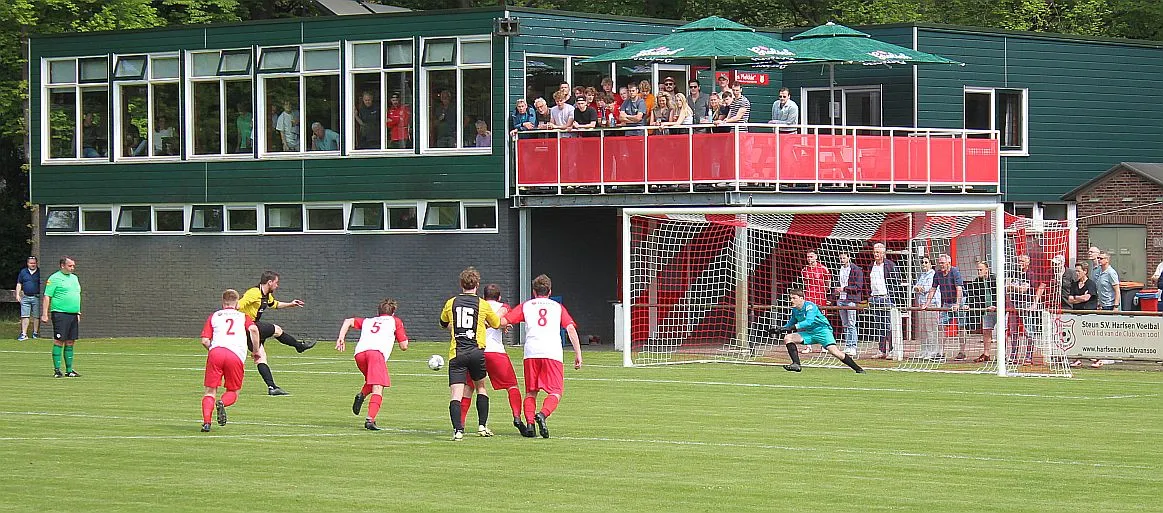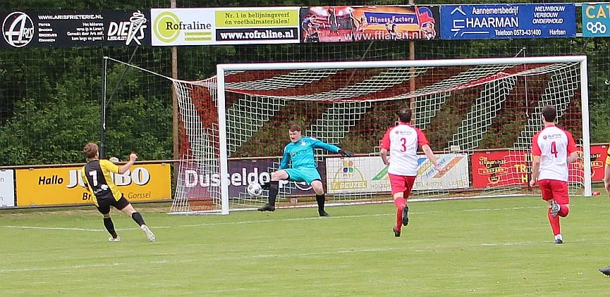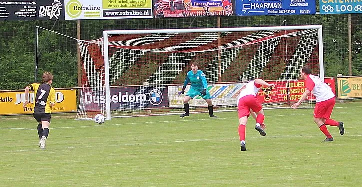 Harfsen komt er niet aan de pas, ze zoeken continu de vleugels met cros passes maar de tweede bal is telkens voor Gorssel die daarmee het overwicht behoudt. Toch komt Harfsen op gelijke hoogte door de individuele kwaliteit van Sven. Hij houdt op de achterlijn de verdediger van zich af, omspeelt hem knap en gaat richting 5 meter waar hij vol uithaalt. Drie man en de keeper proberen te blokken maar de bal vliegt in het dak en het is weer 1-1.