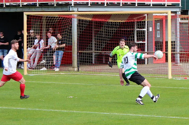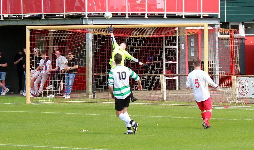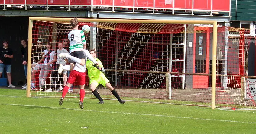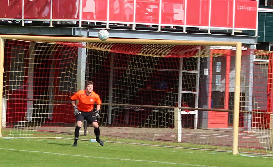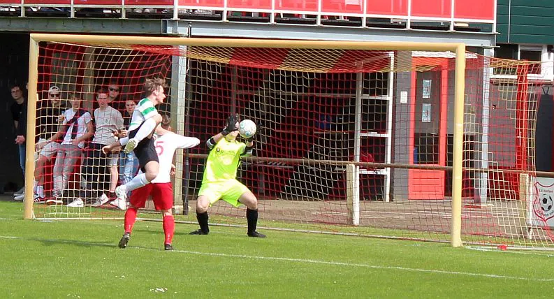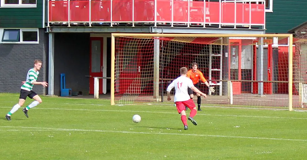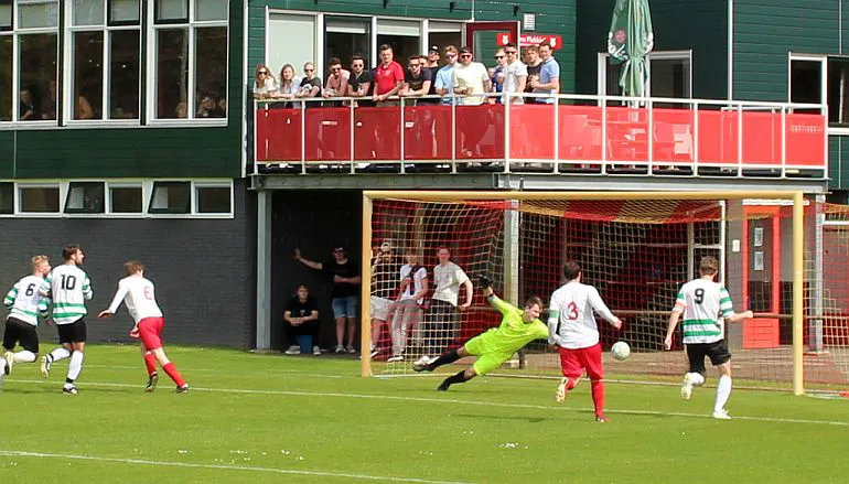 Natuurlijk valt hij dan wel voor de gasten. De linksback kan zo opduiken in het strafschopgebied en wipt heel knap de bal over de uitkomende Joost. Het is weer 3-3, nog 10 minuten te gaan.