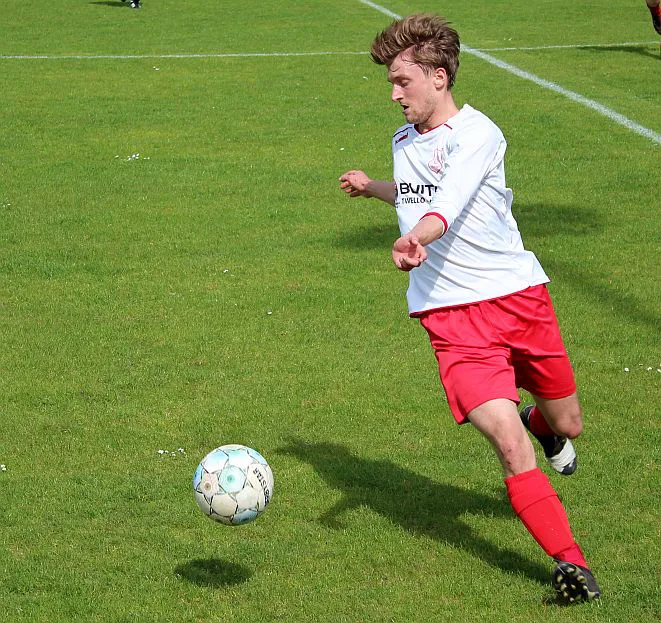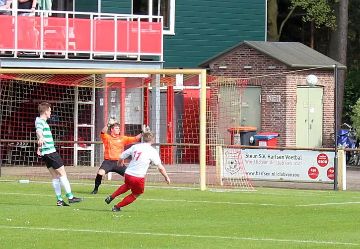 Al snel na de aftrap blijkt dat Harfsen voetballend goed mee kan in deze competitie, het duel gaat gelijk op waarbij de thuisploeg meer het spel naar zich toetrekt. Aan beide kanten worden halve kansjes gecreëerd, er is evenwicht. Maar Harfsen is afhankelijk van enkele key spelers die hun dag moeten hebben en boven het gemiddelde uitsteken. Het publiek veert dan ook op als Chiel wordt weggestuurd aan de linkerkant, de verdediger is hem kwijt en de keeper komt uit. Chiel bedenkt zich niet en geeft een magnifieke lob, het is 1-0. So Far So Good.