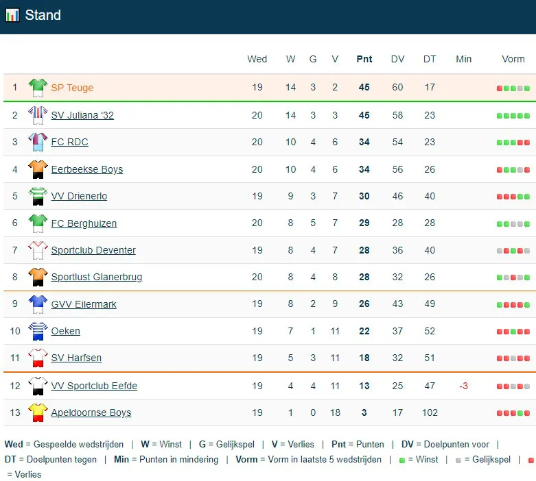 Het staat nu bijna vast dat Harfsen nacompetitie moet spelen. Er is zelfs een supporter die rechtstreekse degradatie vreest. Met een blik op de stand is dat niet eens ondenkbaar als volgende week weer verloren wordt van Eefde. Maar het gat van 5 punten is wat dat betreft geruststellend. De nieuwe stand (hieronder) schetst echter wel een somber perspectief.