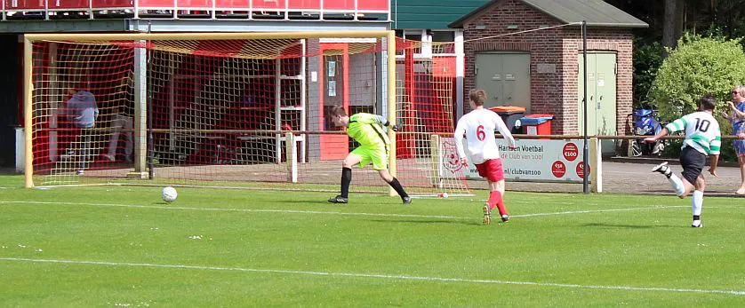 Dat genieten duurt maar 5 minuten als Drienerlo zich wat herpakt, ook de spelverdeler van de gasten heeft een mooie lob in huis, het is 2-1. Meteen sluipt er onzekerheid in de Harfsen ploeg, Drienerlo doet weer vrolijk mee en aan beide kanten rijgende kansjes zich aaneen. Gelukkig wordt de rust bereikt met de voorsprong.