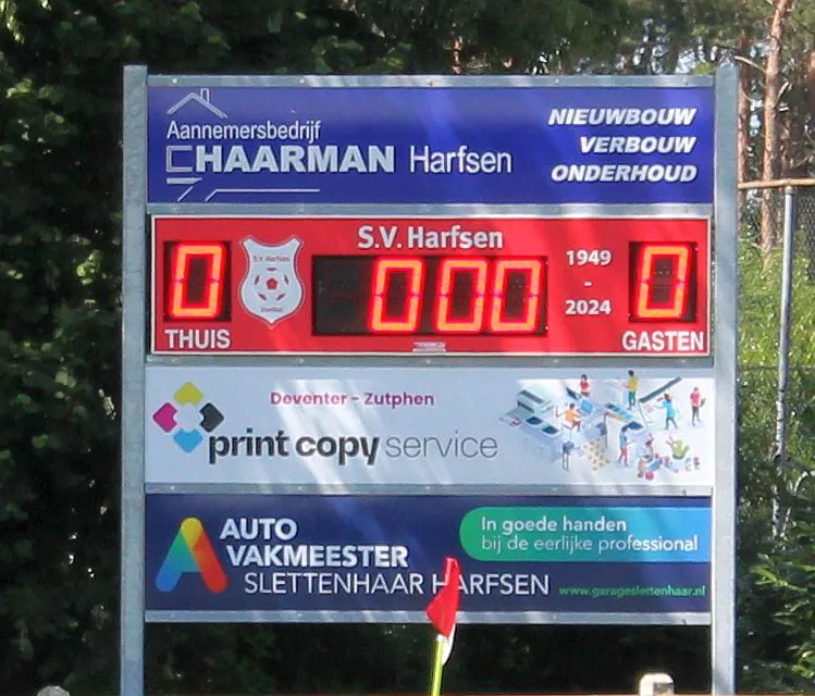 Om 15.00 uur werd vervolgens onder grote publieke belangstelling afgetrapt voor de wedstrijd van Harfsen 1 tegen een streekelftal met spelers van Almen, Eefde, Gorssel en Witkampers. Voor de aftrap werd het nieuwe scorebord door de ereleden Henk Leunk en Henk Pasman officieel in gebruik genomen en we zijn als vereniging de sponsoren die dit mogelijk hebben gemaakt zeer dankbaar voor dit geweldige cadeau.