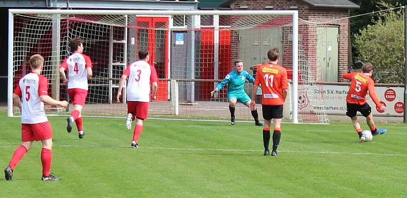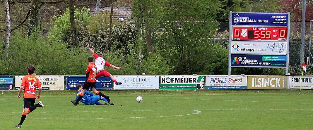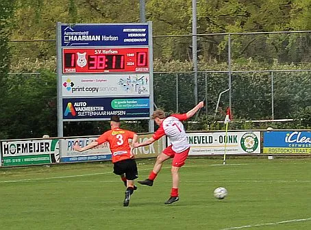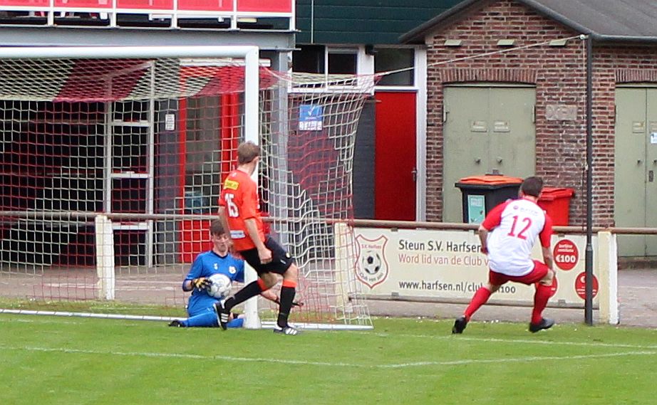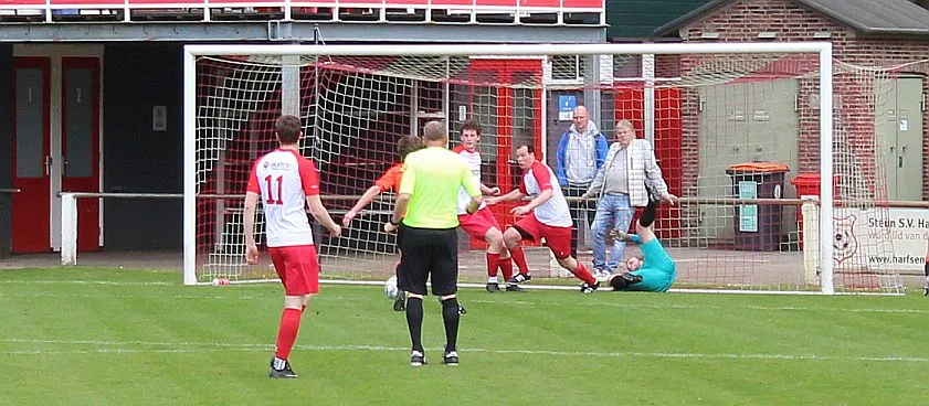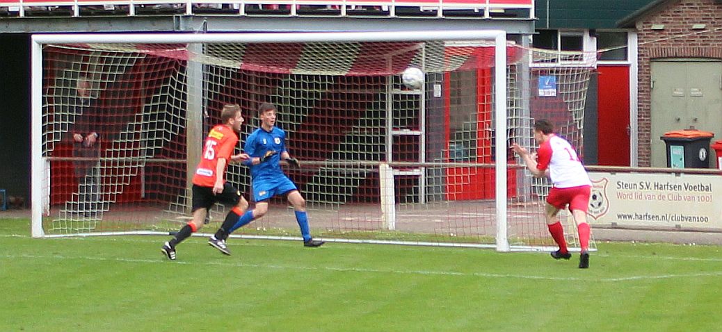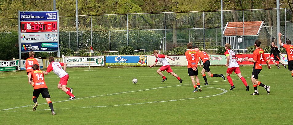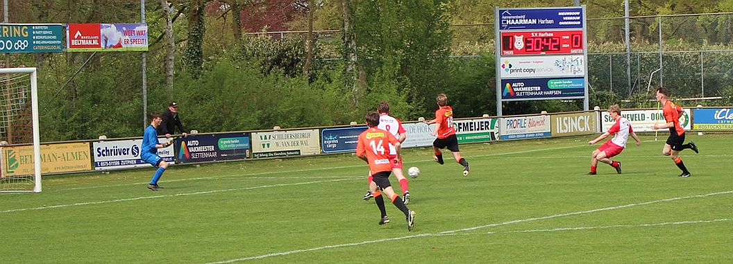 Harfsen begon de wedstrijd nog wel overtuigend en pakte via Bram na 10 minuten een snelle voorsprong maar daarna werd het spel slordiger. Er kwam veel ruimte te liggen tussen de linies en de gasten kregen zeker drie grote mogelijkheden om ook te scoren maar Thom en eigen onkunde voorkwam de gelijkmaker. Tussendoor waren er ook voor Harfsen ondanks het mindere spel nog genoeg kansen om te scoren maar beide ploegen weigerden de trekker vaker over te halen zodat met een 1-0 stand de kleedkamer werd opgezocht na 45 minuten.