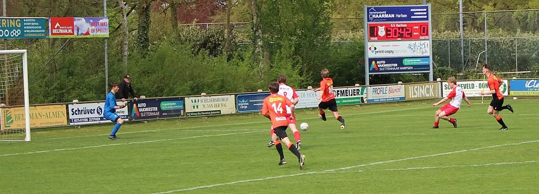 In de tweede helft was een ander Harfsen te zien dat de zaken overtuigender en energieker aanpakte. ZVV kreeg geen ruimte meer en werd vast op eigen helft gezet en Harfsen trok de wedstrijd volledig naar zich toe met snelle korte combinaties afgewisseld met goede kantwissels. Onder meer Arthur speelde daarin een belangrijke rol en samen met Luc Jimmink stond hij vaak aan de basis van een mooi opgezette aanval. Het goede spel in deze tweede helft werd bekroond met prima goals van Sven en Luc Valkeman waarna Jochem uit een corner van Chiel de 4-0 eindstand binnen kopte. De score had nog groter kunnen uitvallen maar een door Jochem versierde penalty was helaas niet besteed aan Luc Valkeman waardoor de eindstand niet meer veranderde.